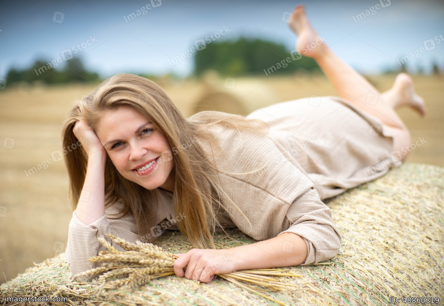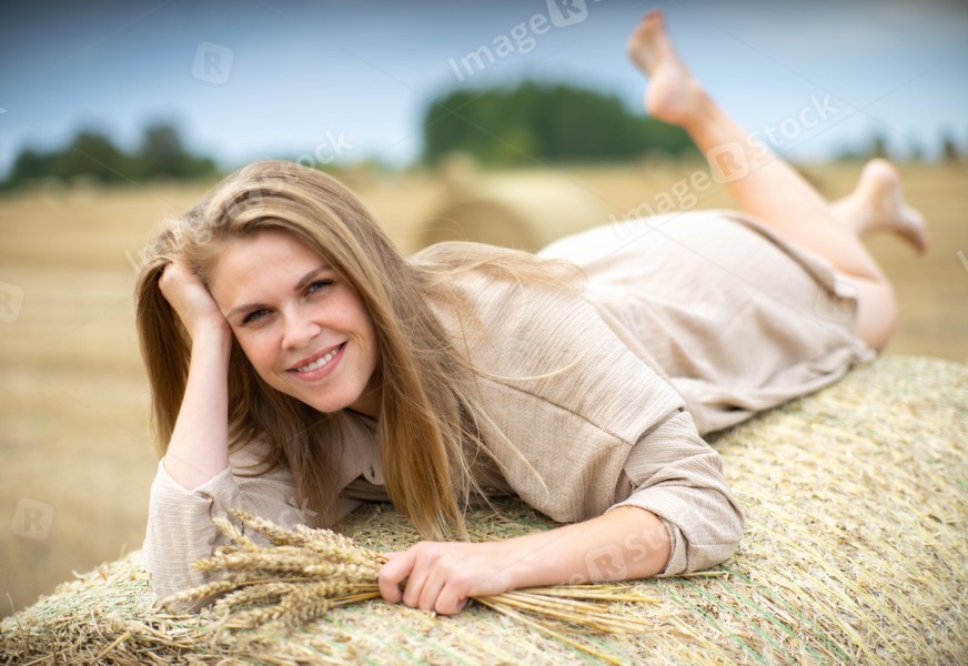 Beautiful happy woman lying on a haystack.