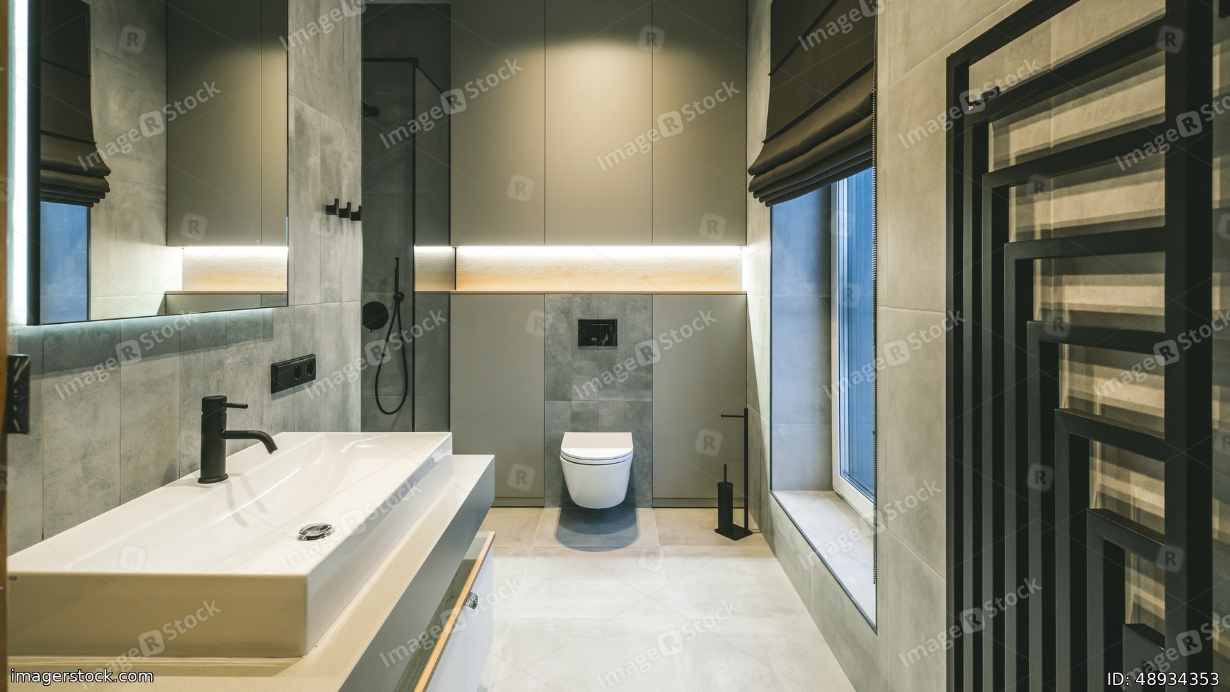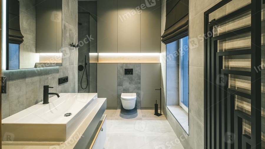 Modern interior in grey tones of bathroom in luxury apartment.