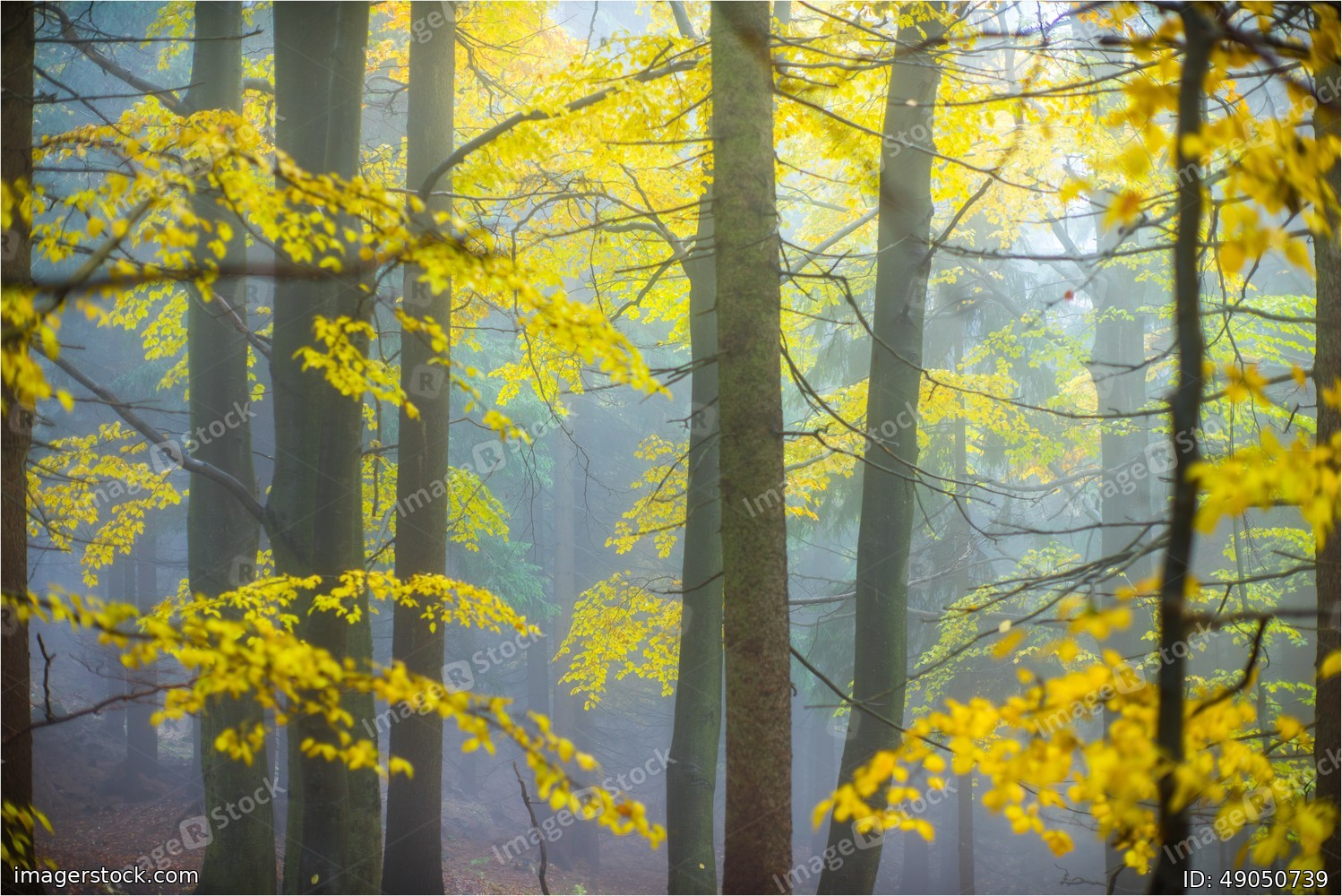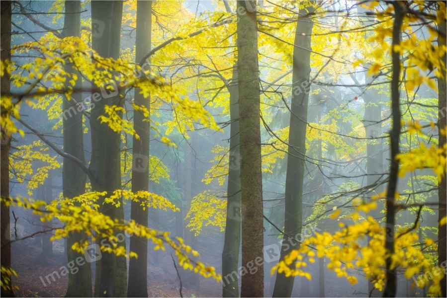 Autumn yellow forest with white fog.