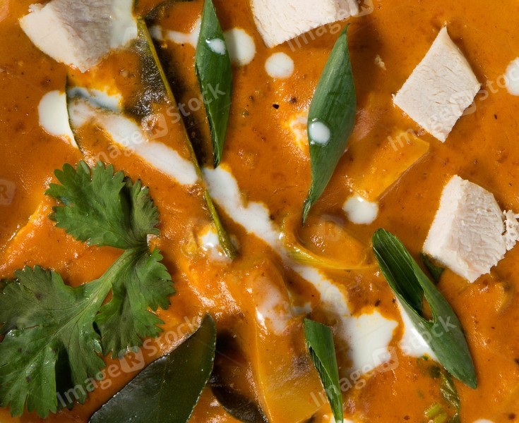 Close-up of a delicious cream soup with chicken and herbs. Tasty food.
