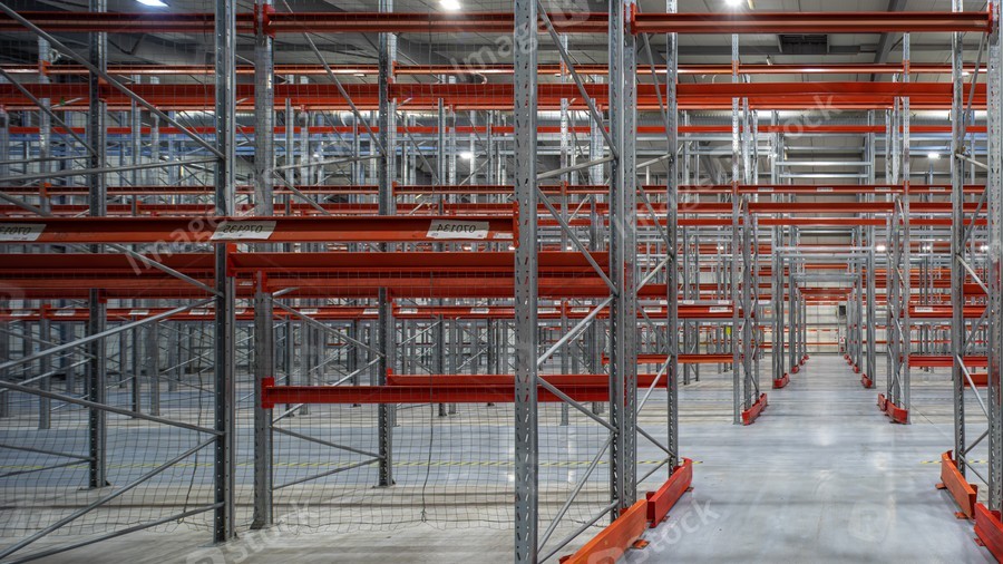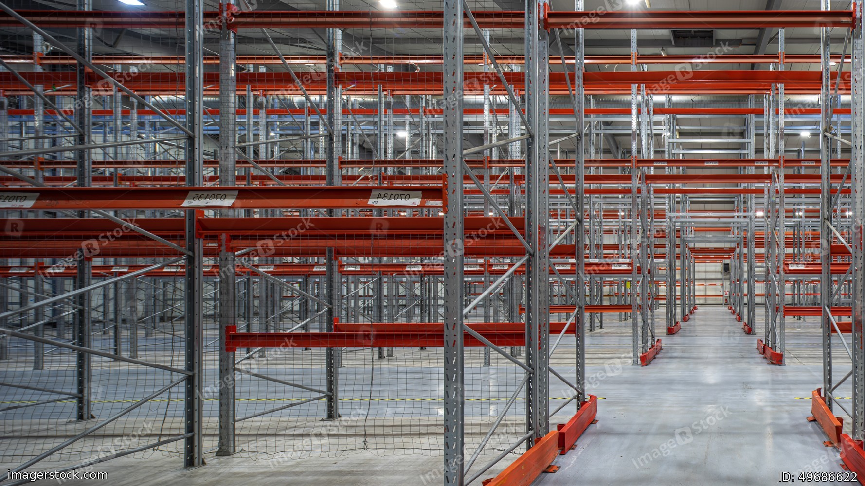 Interior of huge empty storehouse. Industrial warehouse racking.