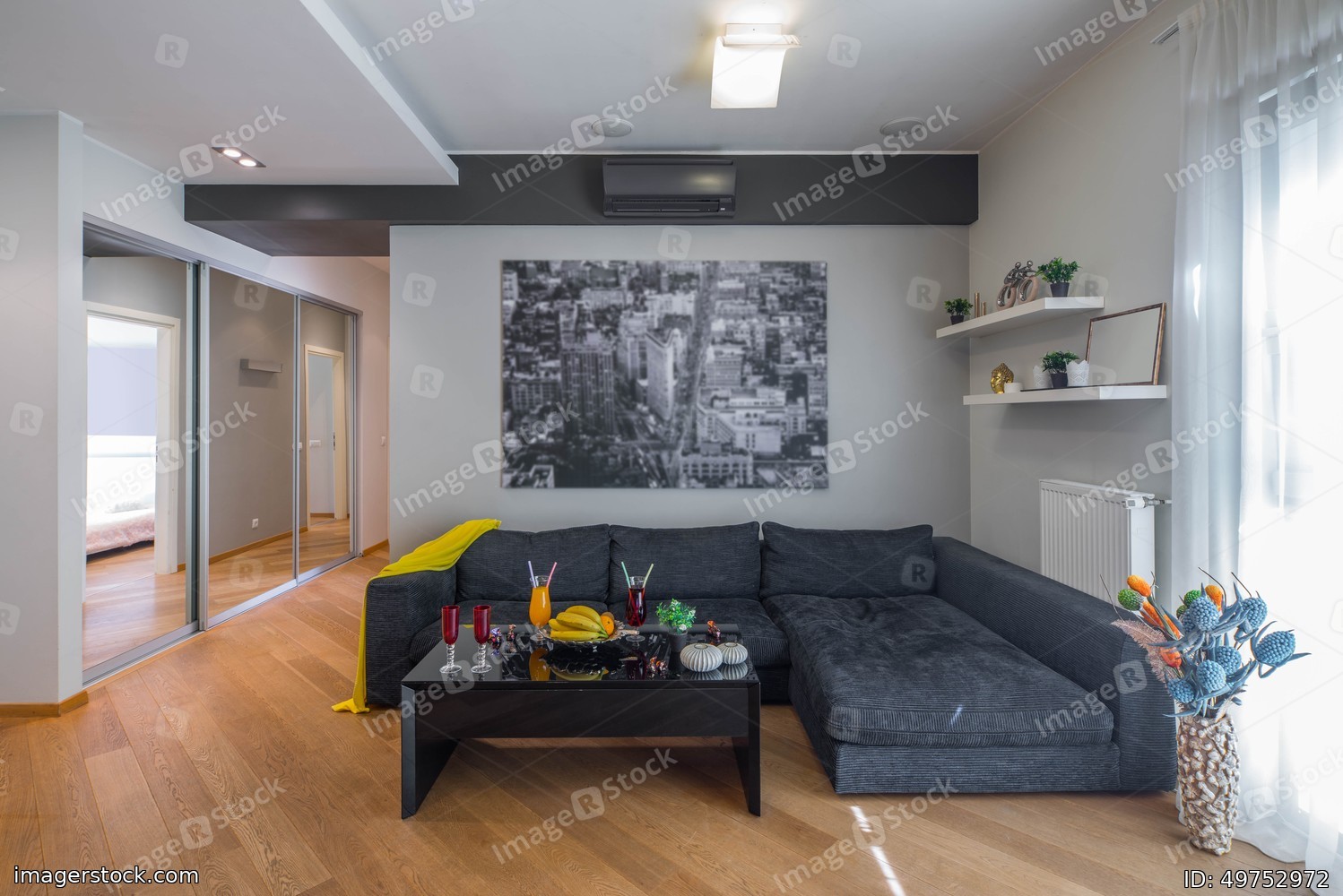 Cozy sofa. Living room. Wall with window. Small table with food and drinks.