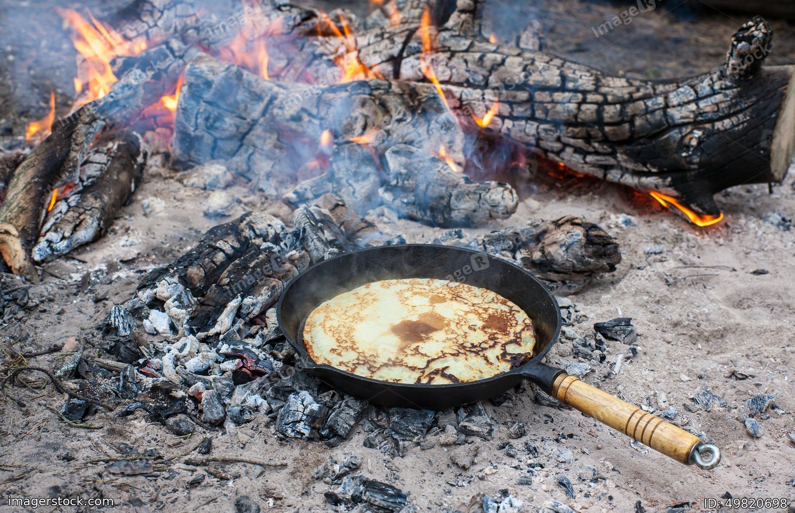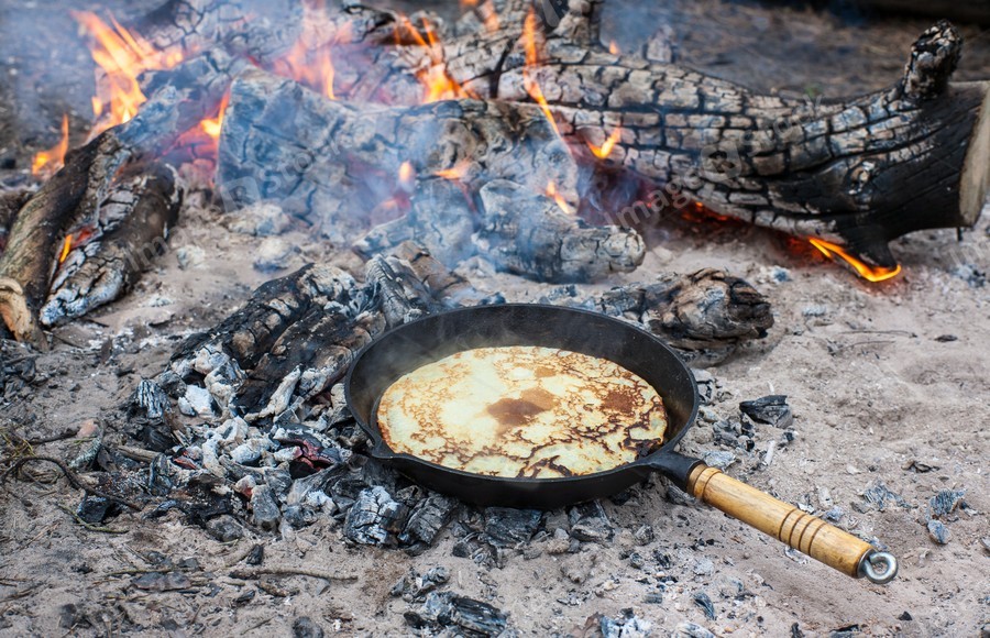 Cooking pancakes on the fire in the forest.