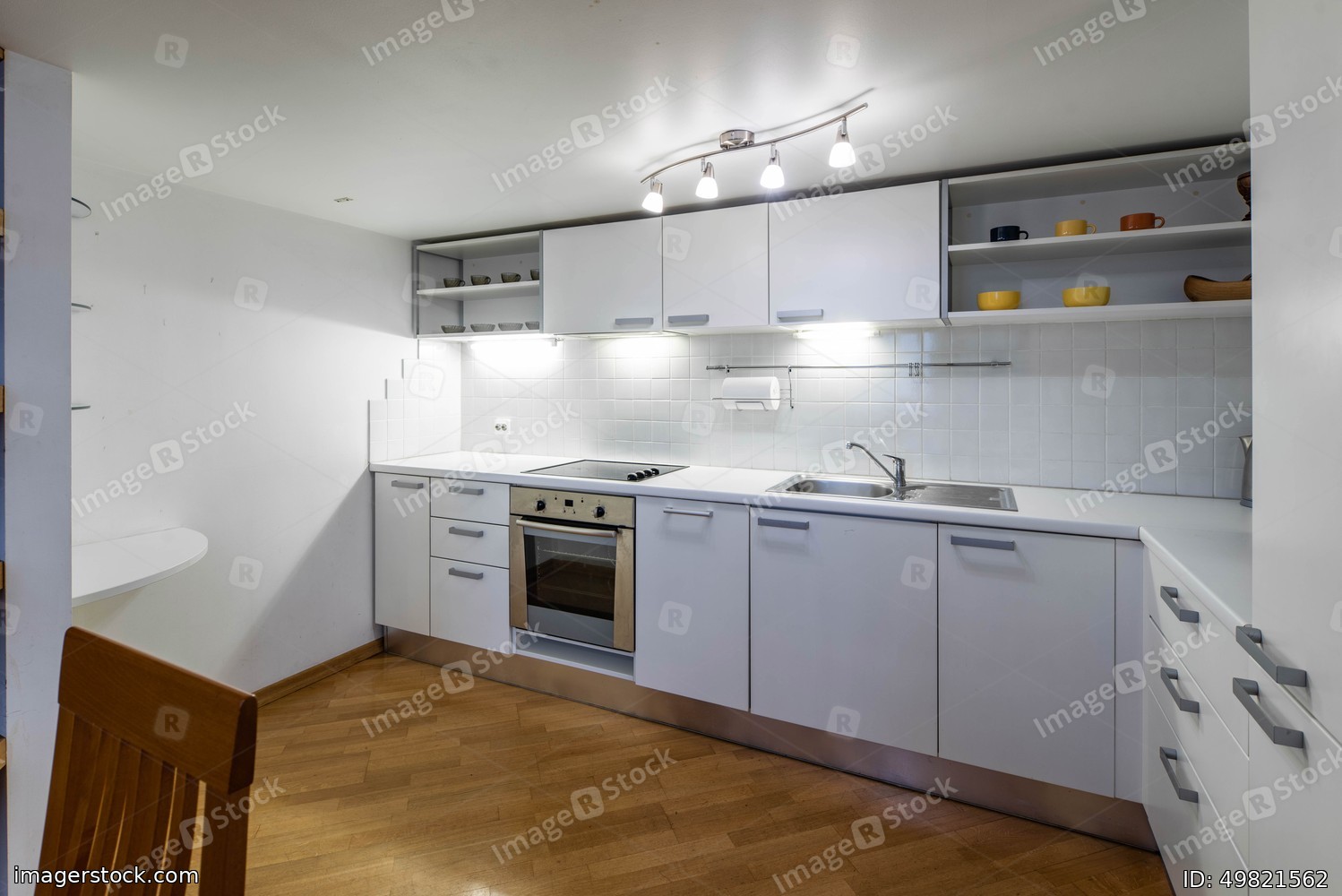 Kitchen in studio apartment. White interior. Wooden floor. White kitchen set.