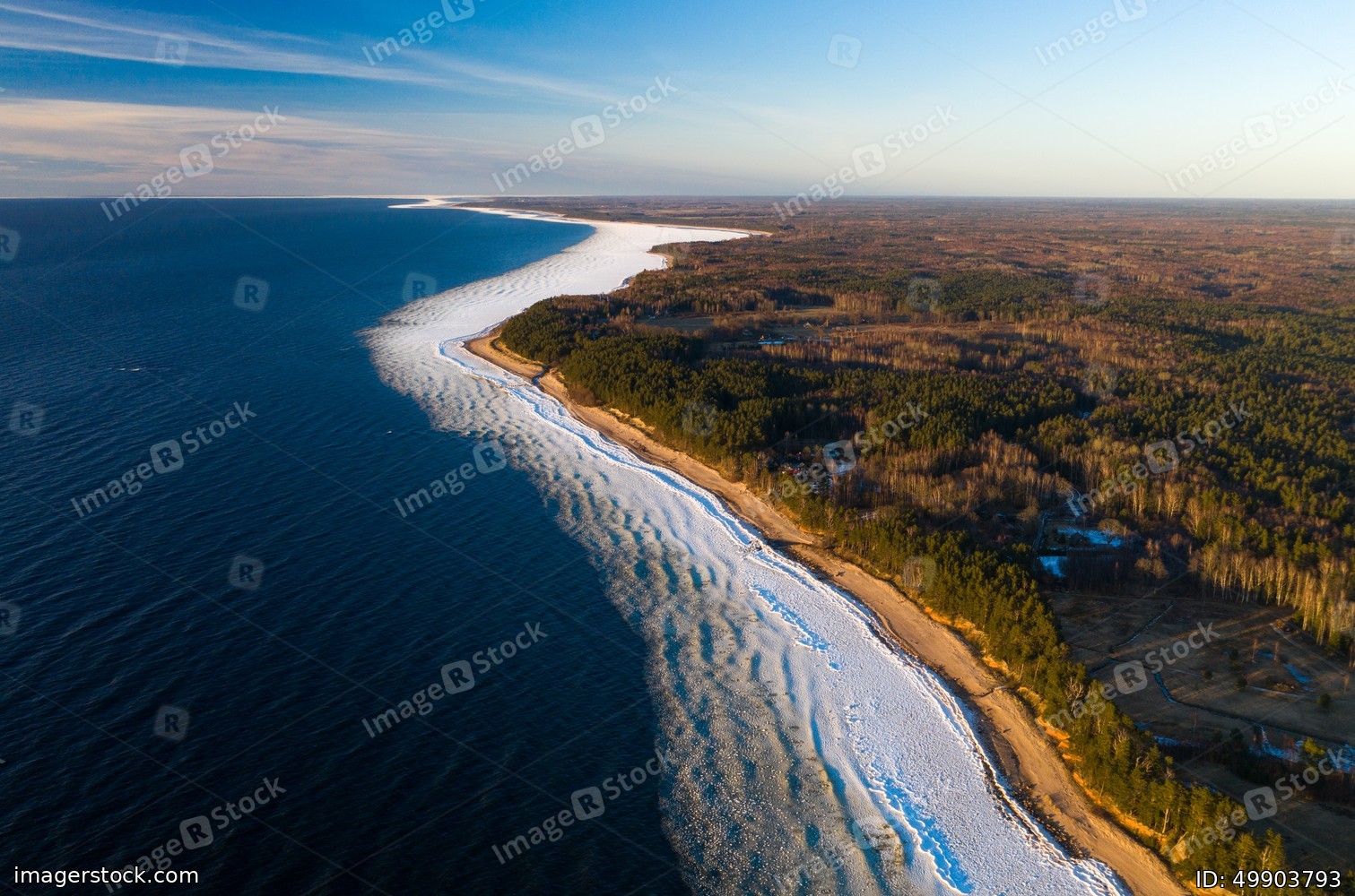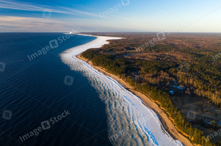 Scenic landscape of shore of Baltic sea at winter. Snow on sand.