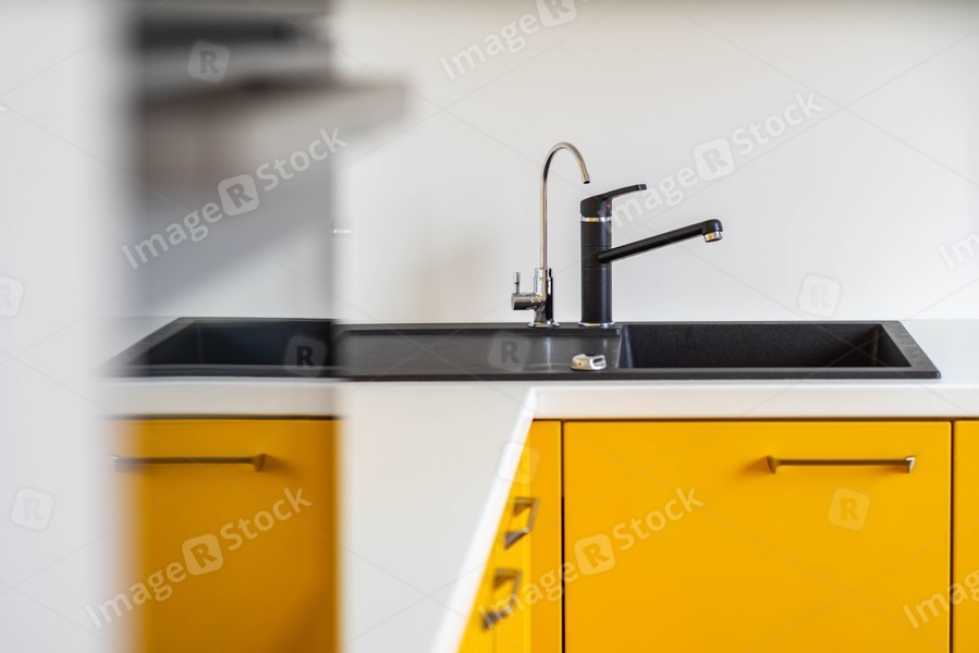 Close-up of black sink and faucet. Modern interior of kitchen. Stylish yellow kitchen set.