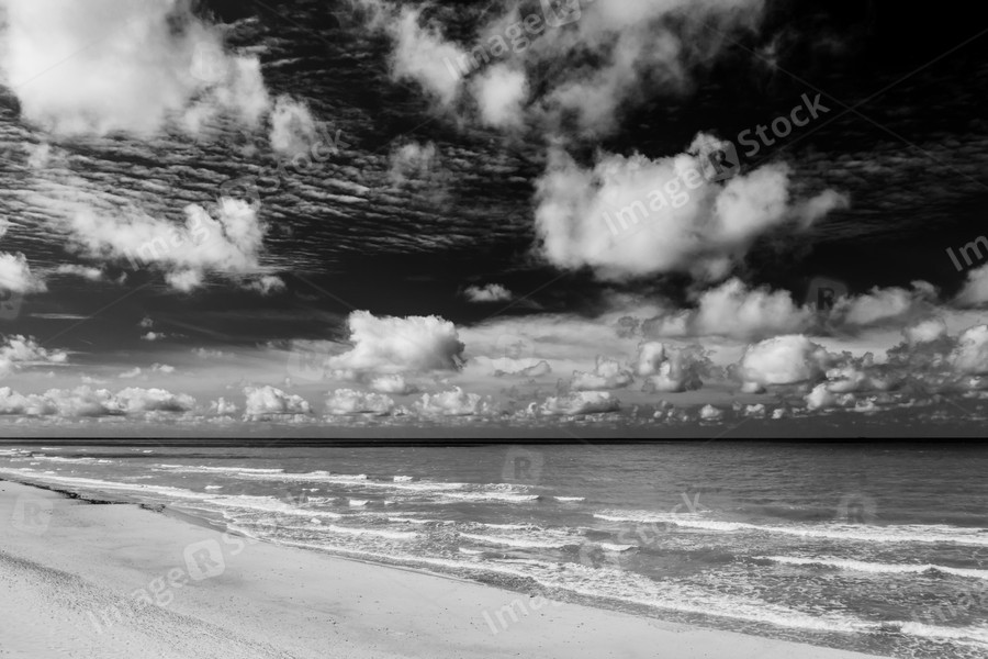 View of the sea. Black and white. Empty seaside. Cloudy weather.
