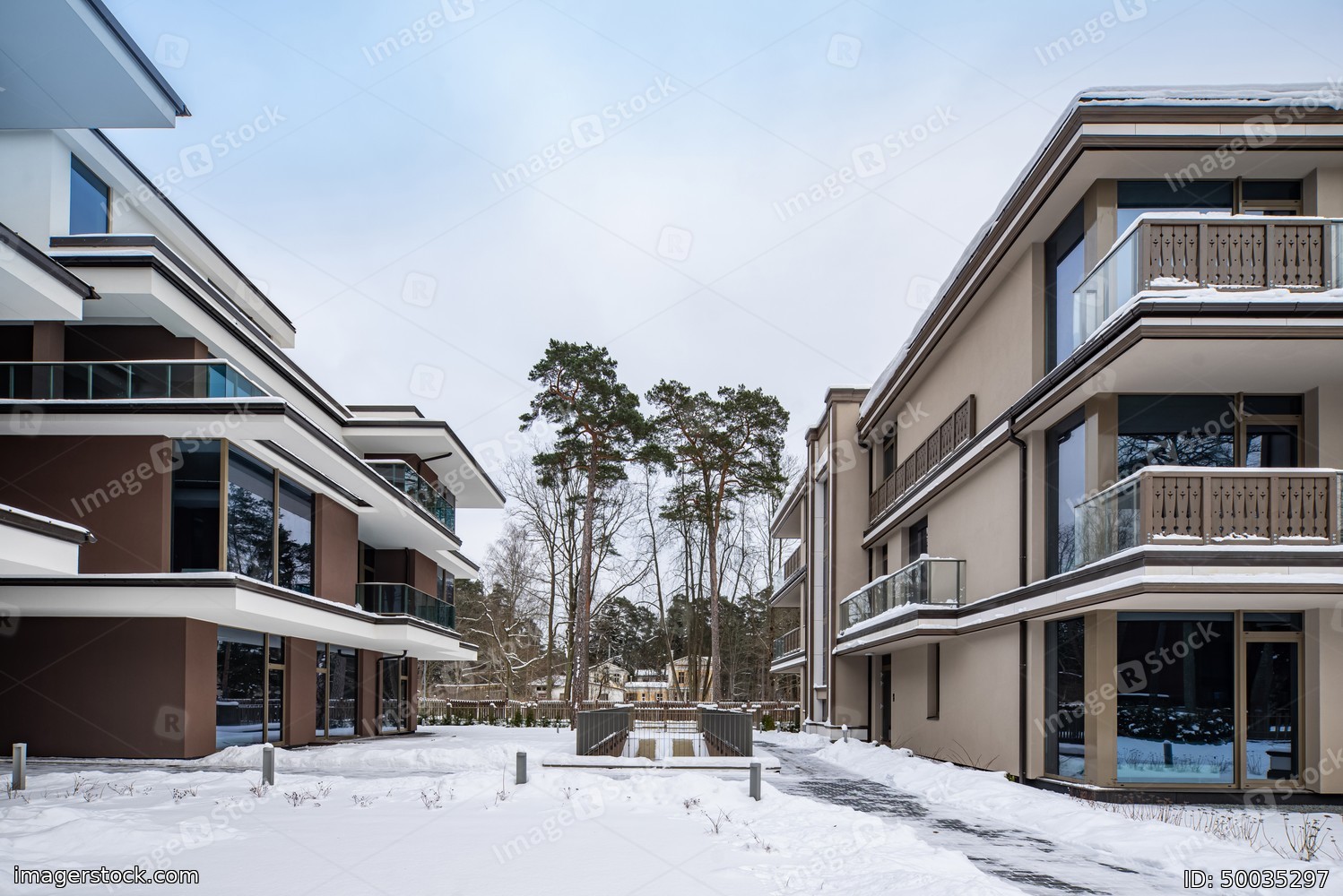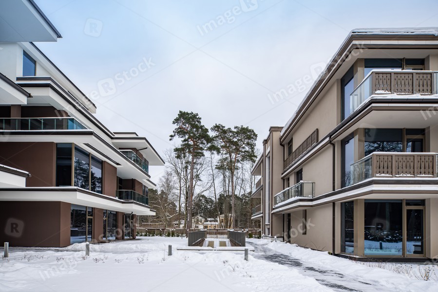 Modern exterior of new luxury residential building at winter.
