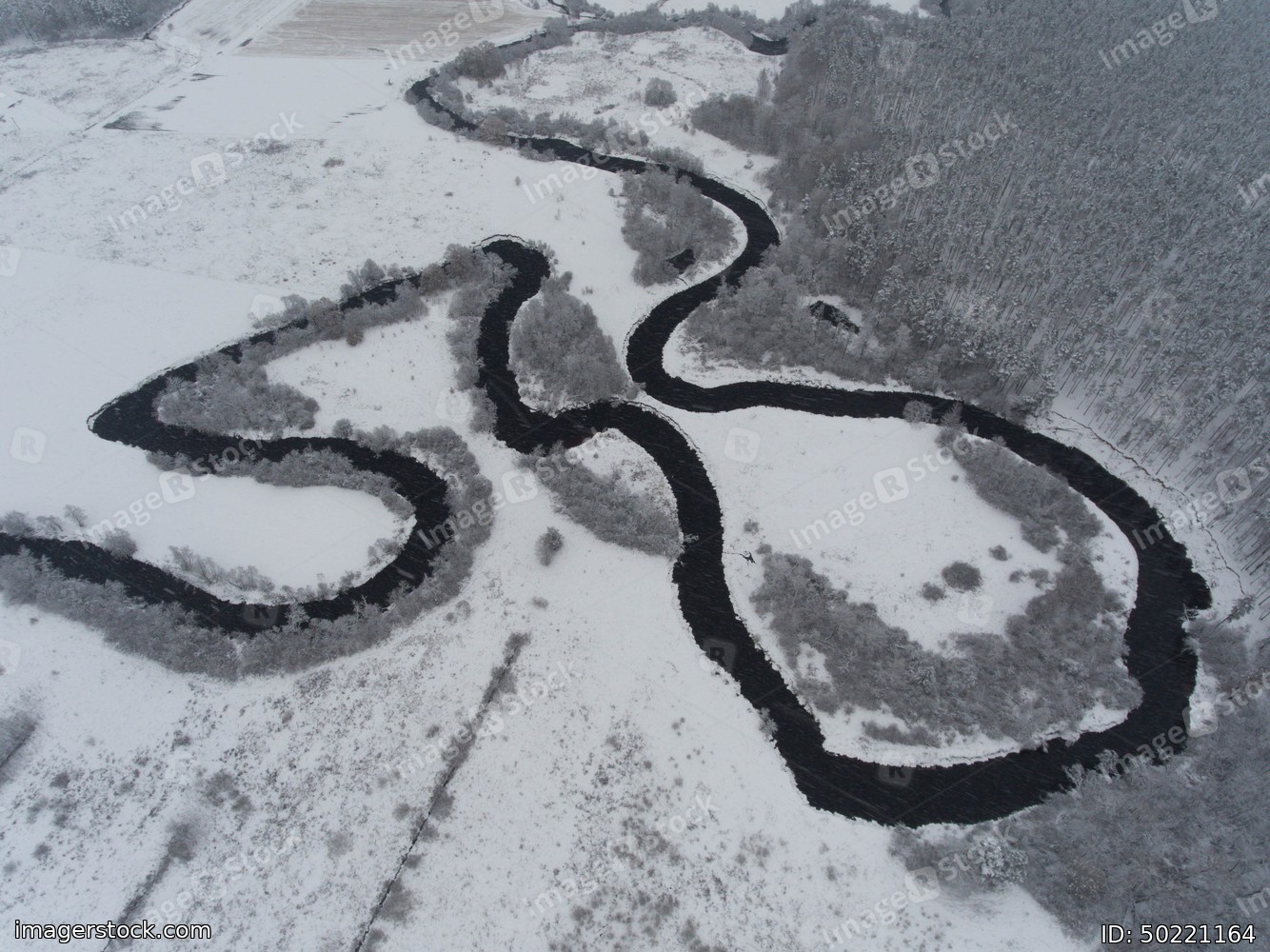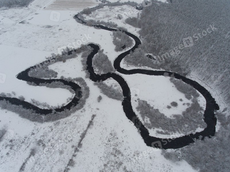 Beautiful winter nature. Aerial view of curved river. Snowy forest and field.