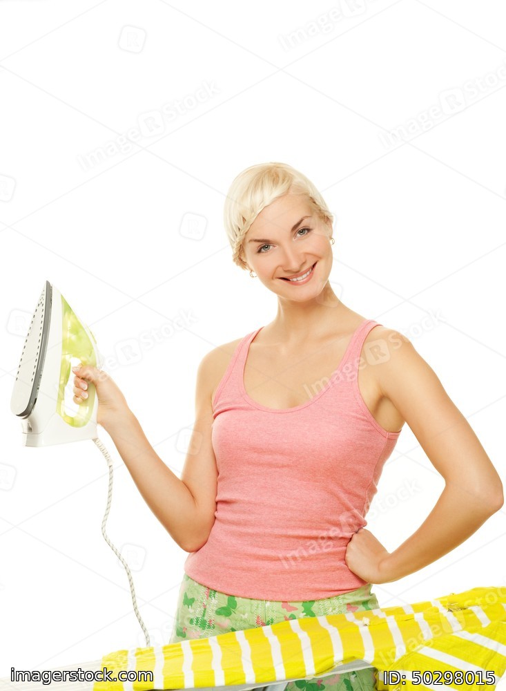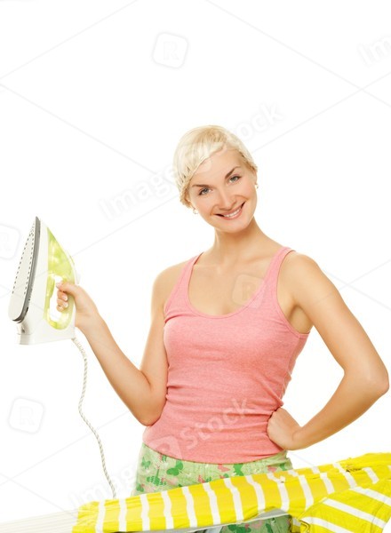 Beutiful woman ironing clothes. Isolated on white background