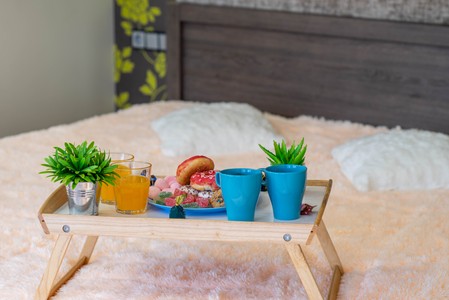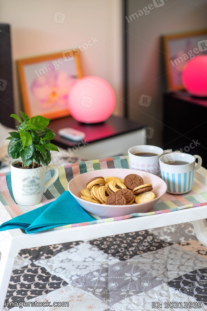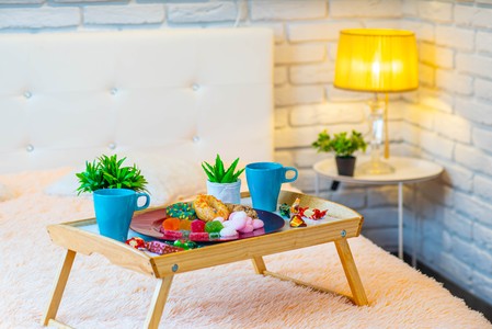 Romantic breakfast. Cookie. Coffee and flower on the tray on the bed. Round pink lamp.