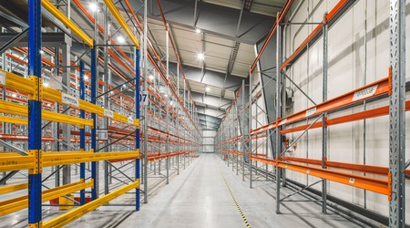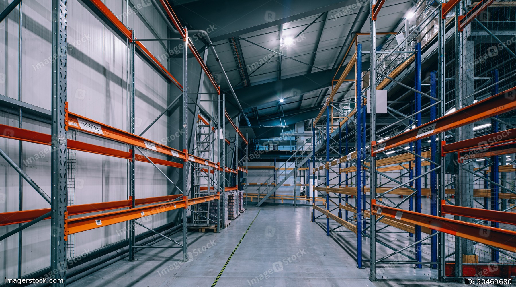 Interior of huge empty storehouse. Industrial warehouse racking.