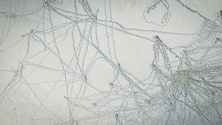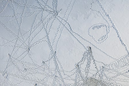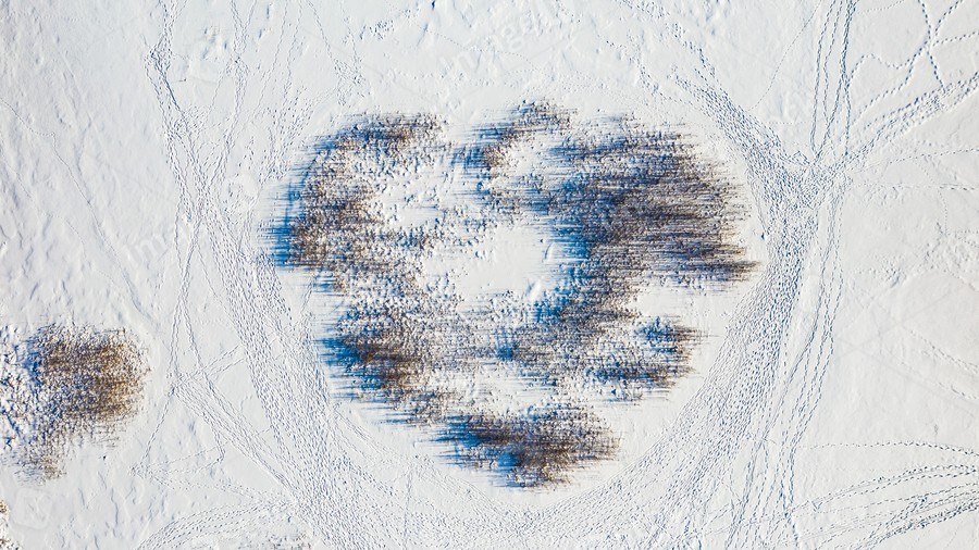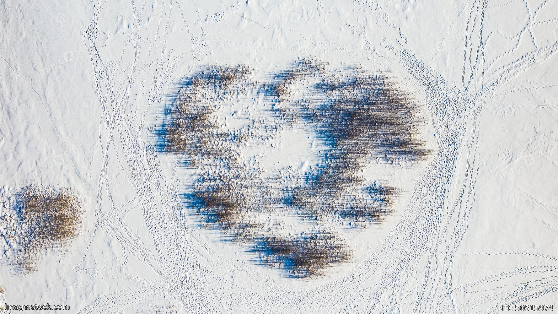 View from above of footprints and blue shadows of naked trees on snow