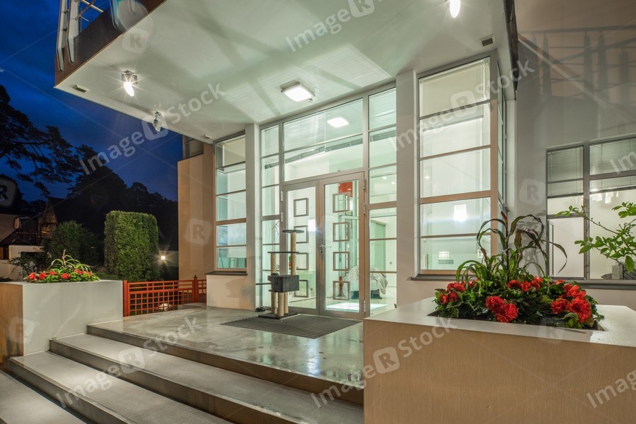 Modern exterior of luxury private house at twilight. Entrance.