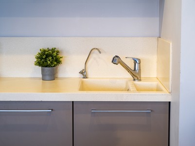 Close-up of sink and faucet in stylish loft interior of bathroom. Decorative flower. Cosmetics and hygiene gels.