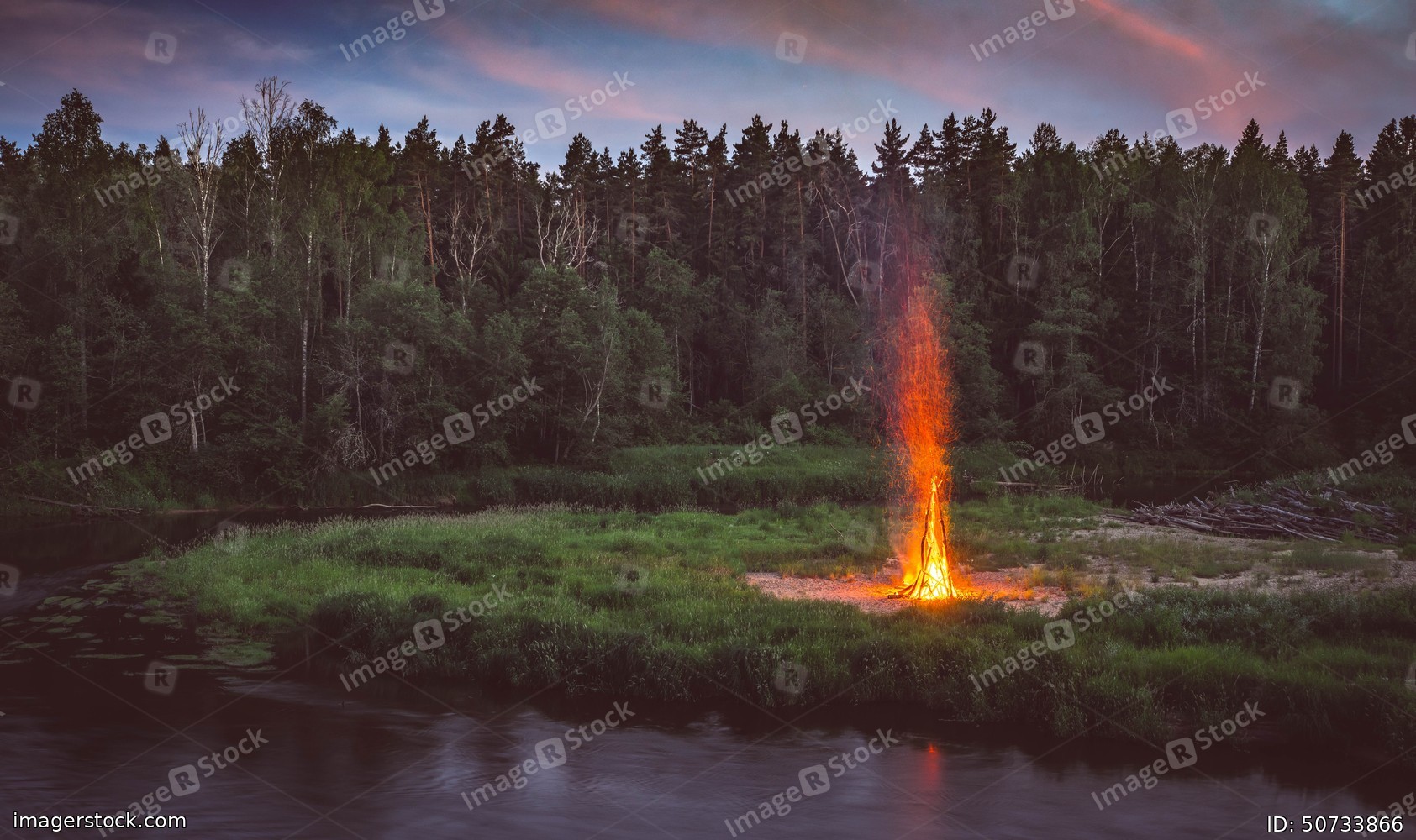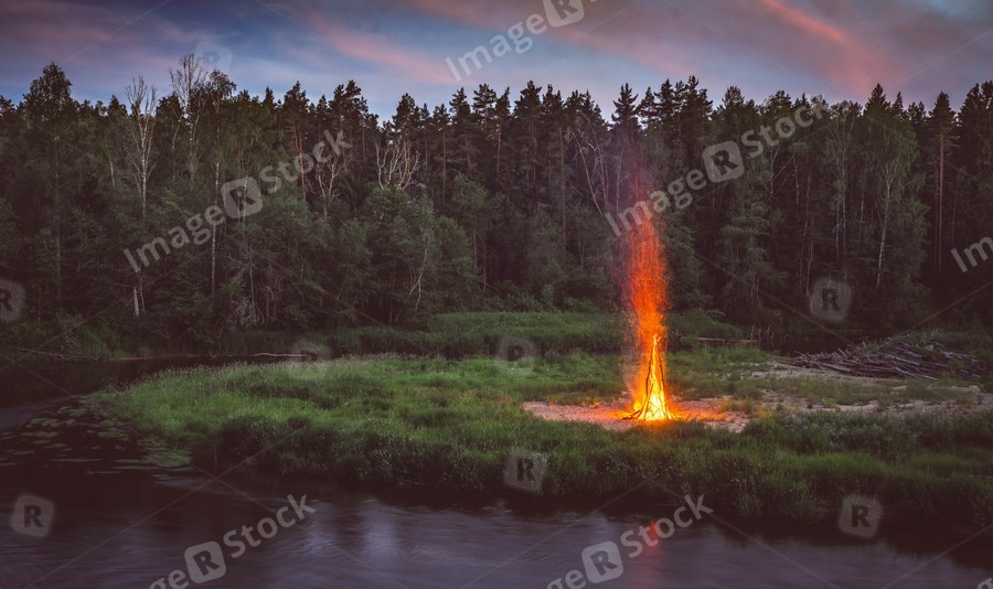 Traditional midsummer Ligo celebration. Huge bonfire on the river shore. Scenic landscape of forest at twilight. Sunset sky.