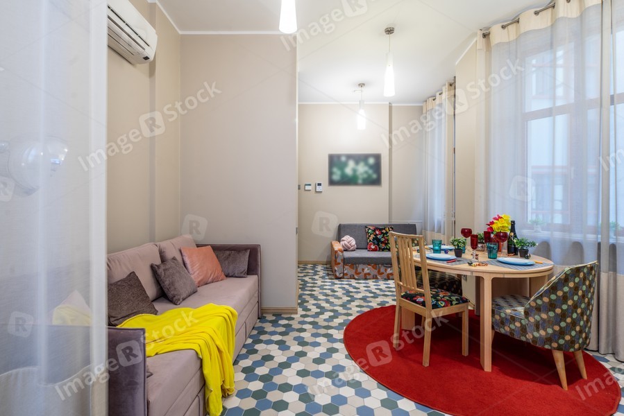 Modern interior of light studio apartment. Living room.