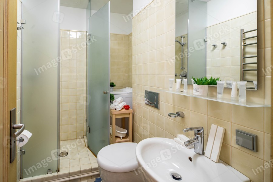 Interior of bathroom in modern apartment. Shower cabin.