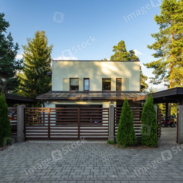 Contemporary exterior of luxury private house at sunny summer day. Green pines. Modern fence.