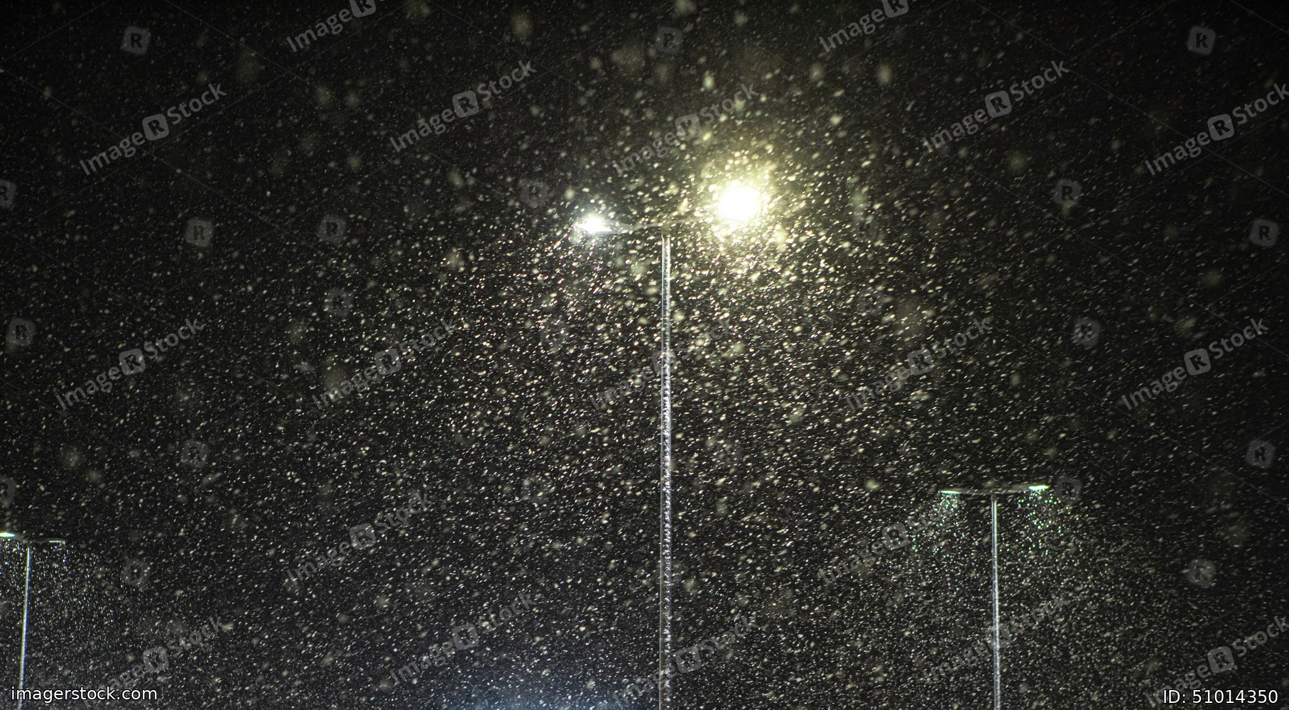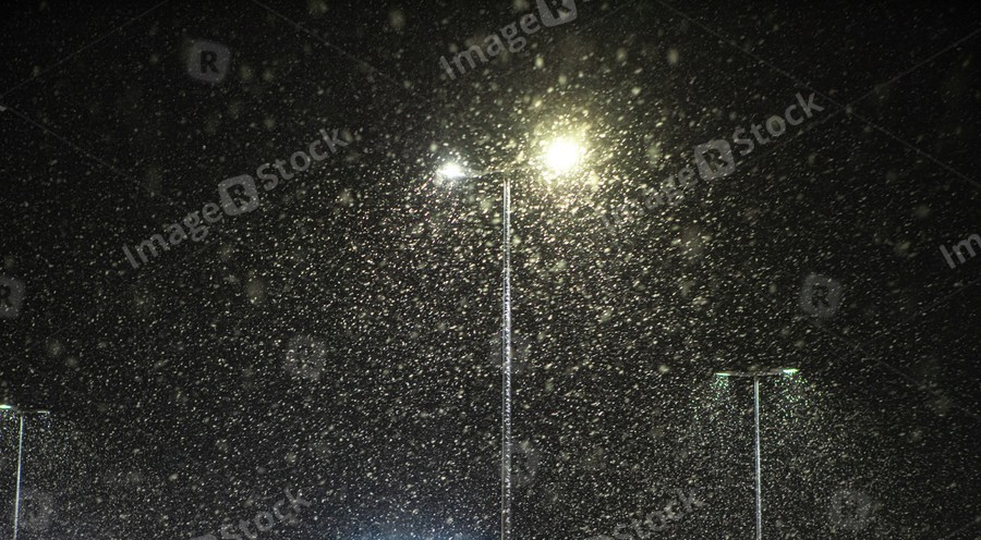 Snow falling on the background of a burning street lamp.