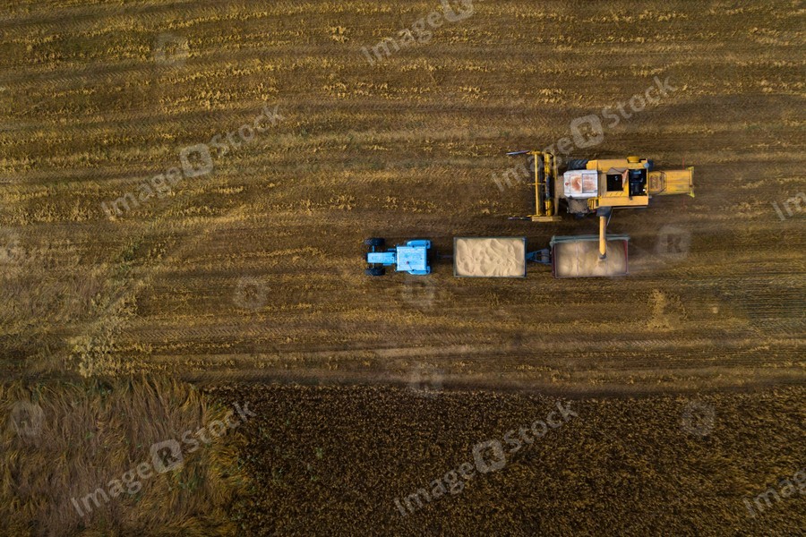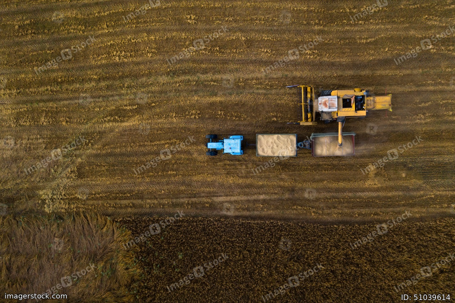 Top view of Combine harvester and the tractor on the field of ripe wheat.