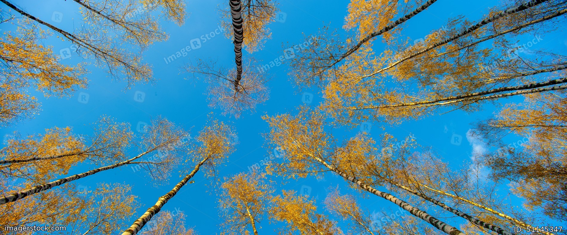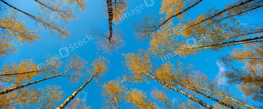 Birches view from below upwards, autumn, yellow leaves. Landscape.