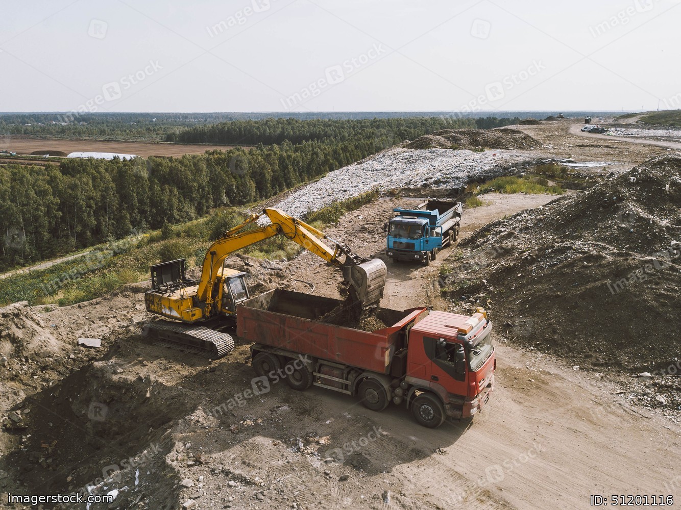 Aerial view of construction works. Earthmoving at open pit mining. Mineral extraction. Excavator loads ground in truck.