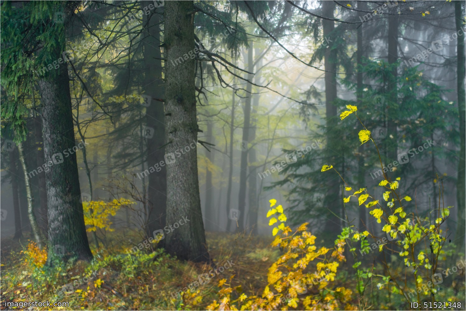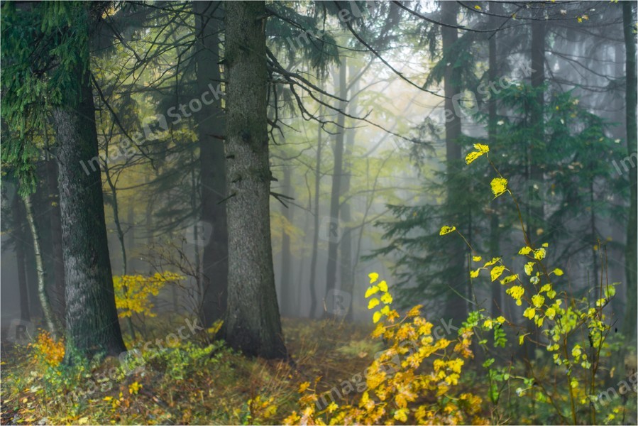 Autumn yellow forest with white fog.
