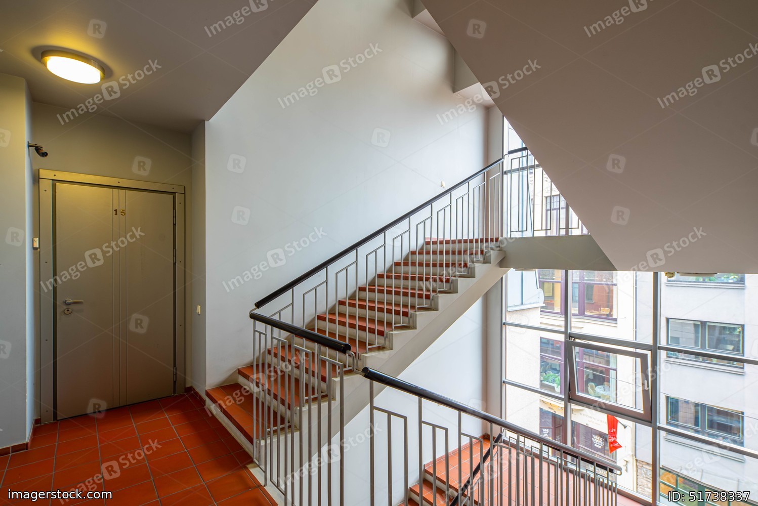 Modern entrance interior in living complex. Flat door. Windows wall. Red tile. Stairs.
