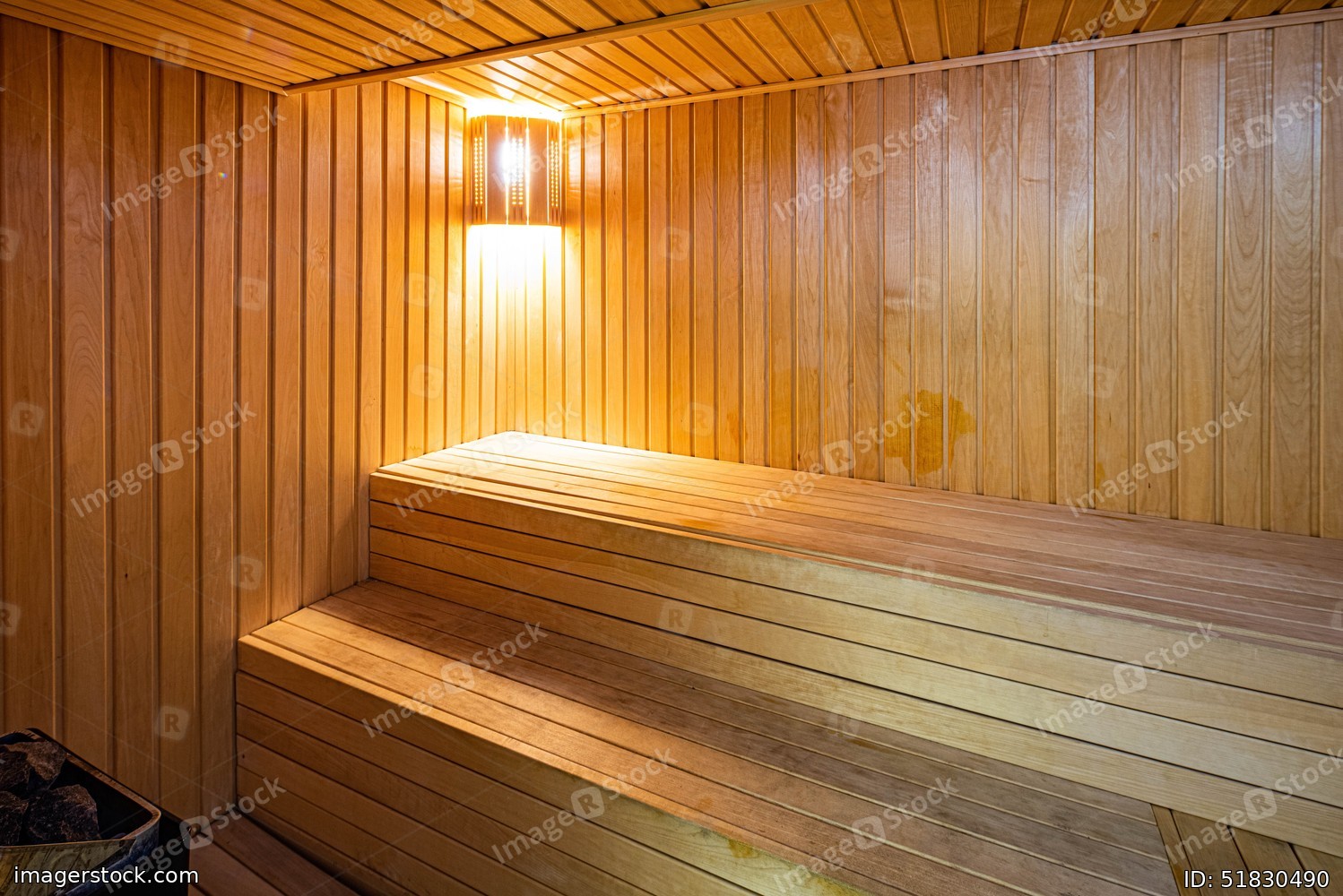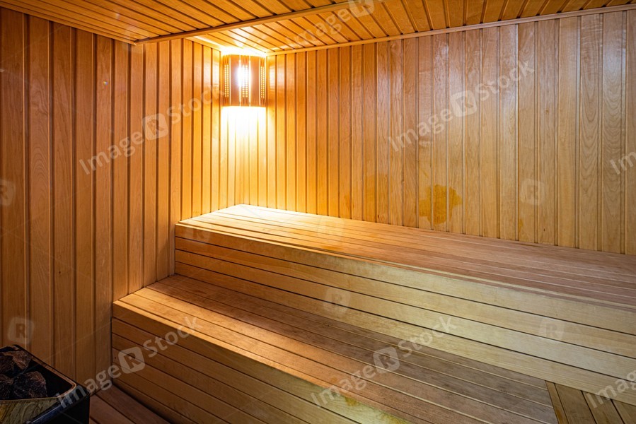 Wooden finnish sauna in private house. Classic interior of sauna.