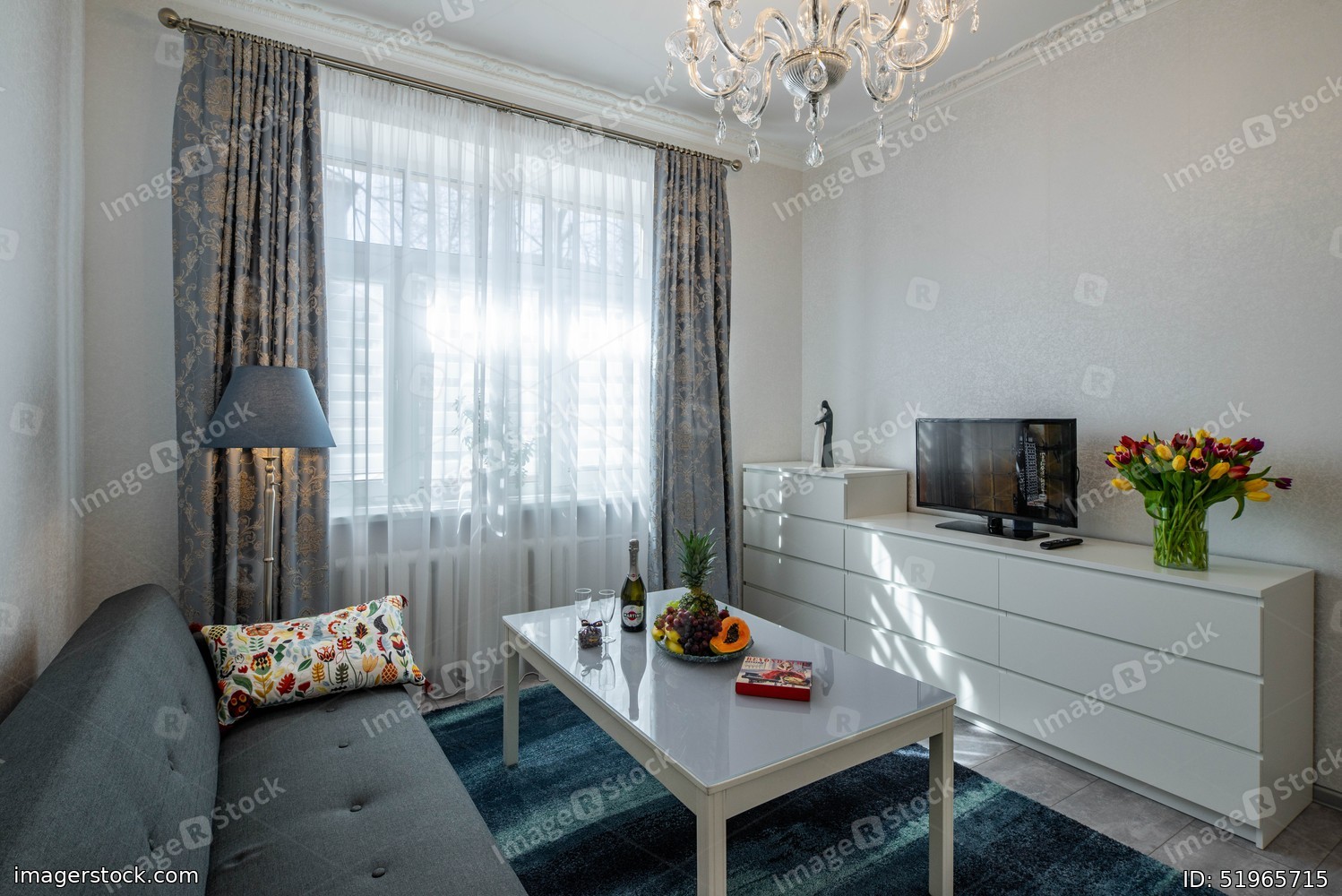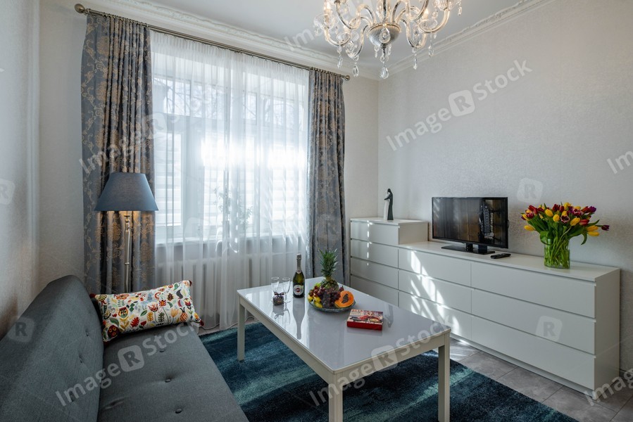 Modern interior of spaious room in shades of light. Furniture and tv.