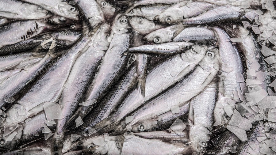 Close-up of frozen sprat in fish market. Winter fishing. Small silver fish production.