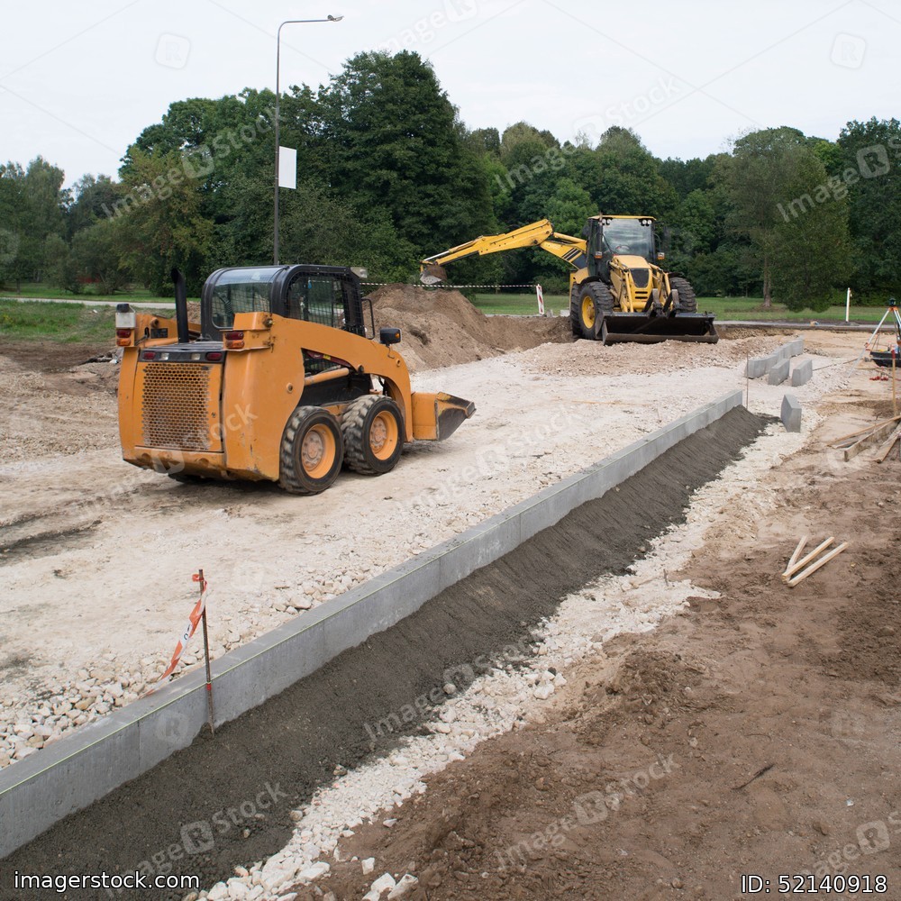 Construction site of new sidewalk. Yellow excavator. Road roller. Skid loader. Install of concrete curb.
