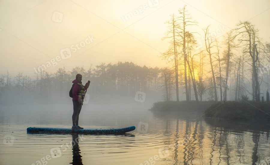 Woman slowly floating on the water on the sup-board. Fog and swamp.