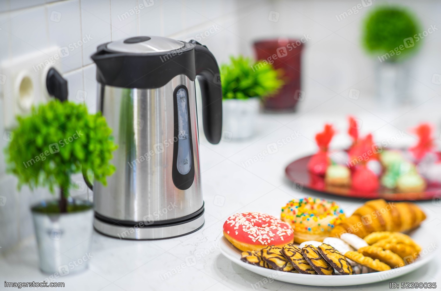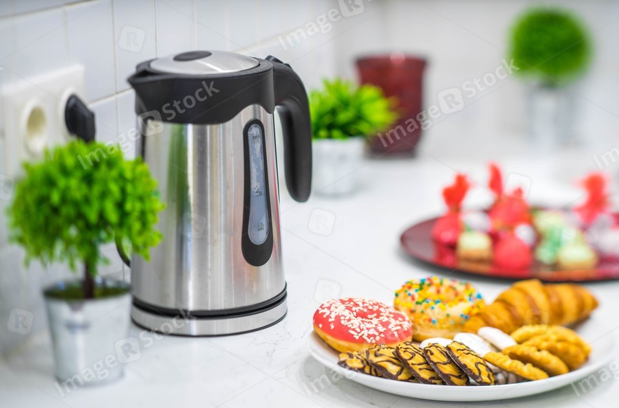Close up of dish with cookies and donuts. White tile. Kettle and decor.