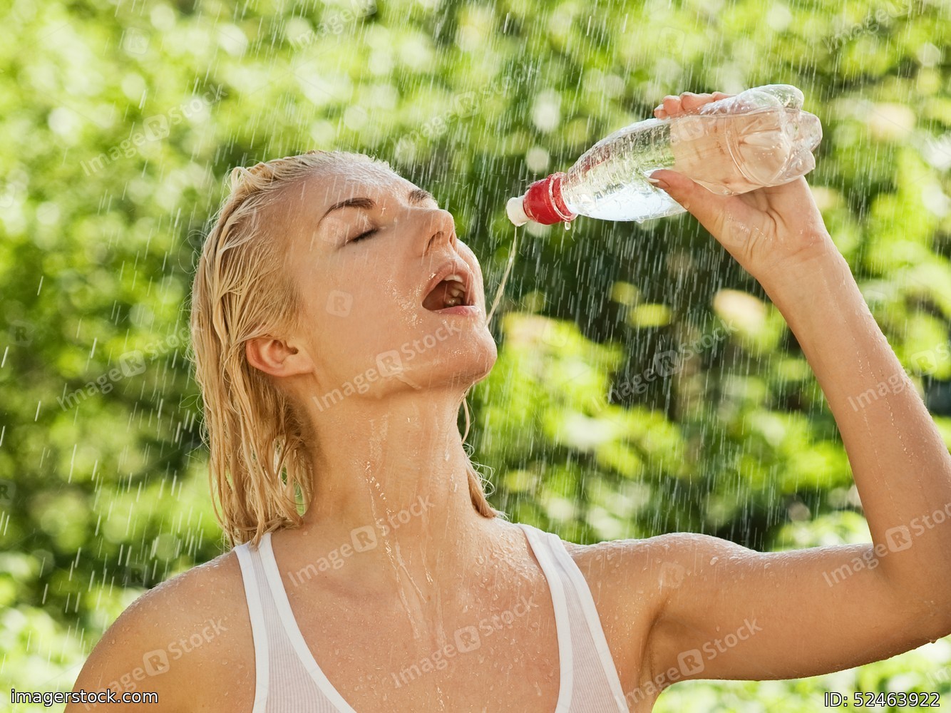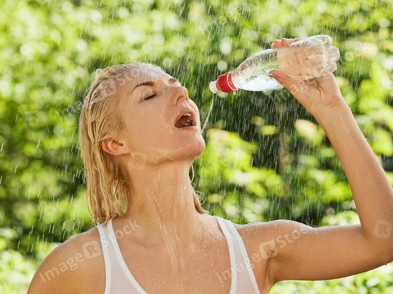 Sexy young woman drinking water under rain