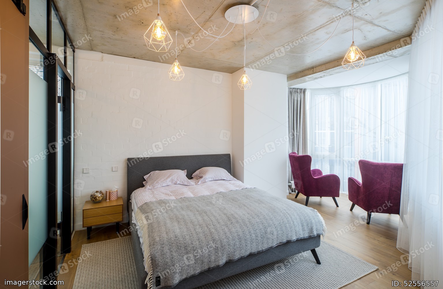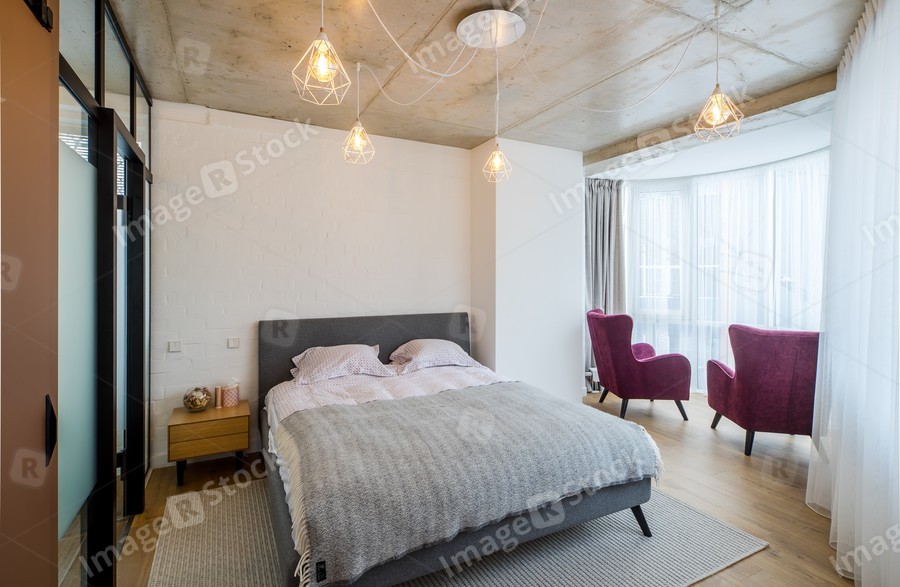 Interior bedroom in the apartment. Concrete ceilings, wooden floor.