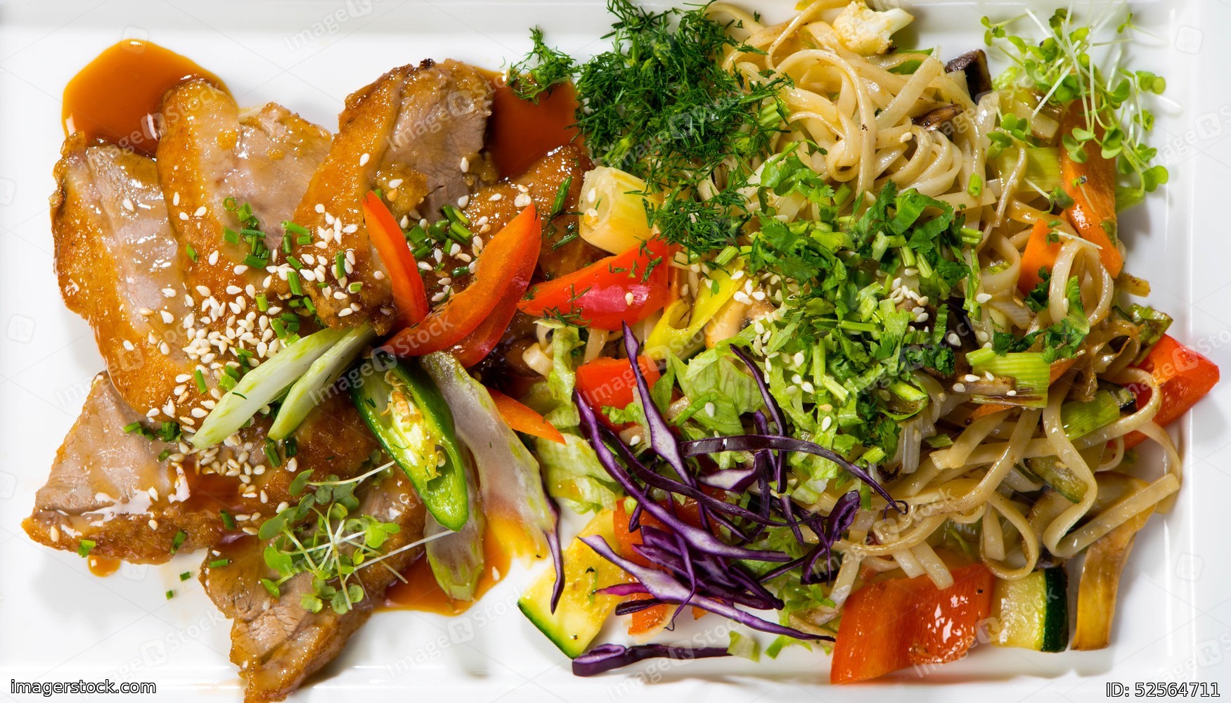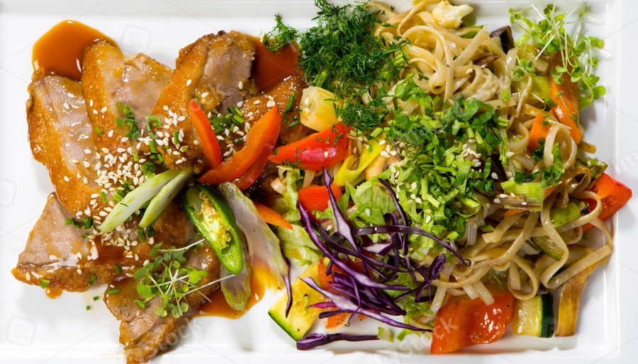 Close-up of fried pieces of meat with vegetables and noodles. Tasty food. Asian cuisine.