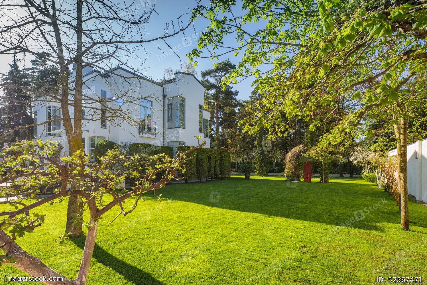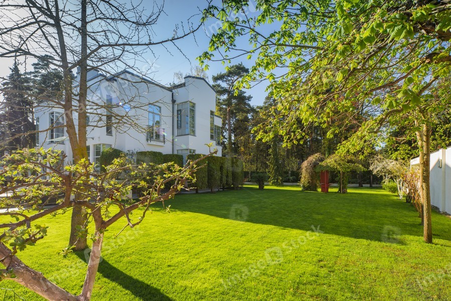 Modern exterior of luxury private house. Green lawn in garden.