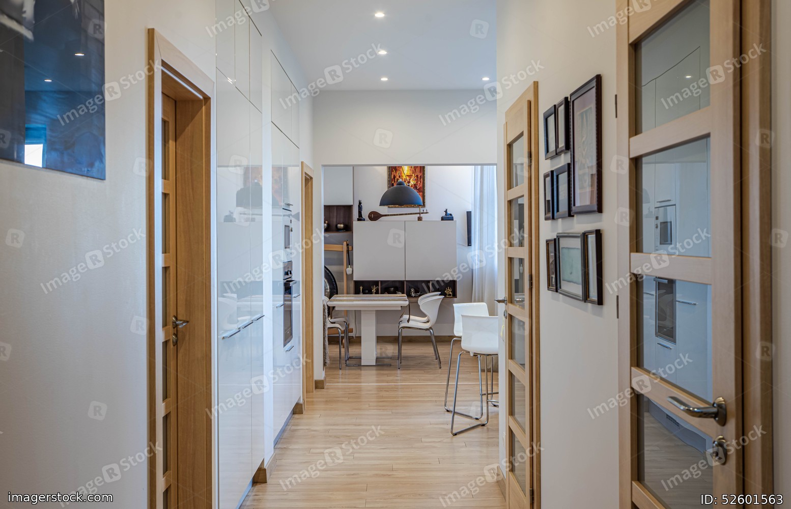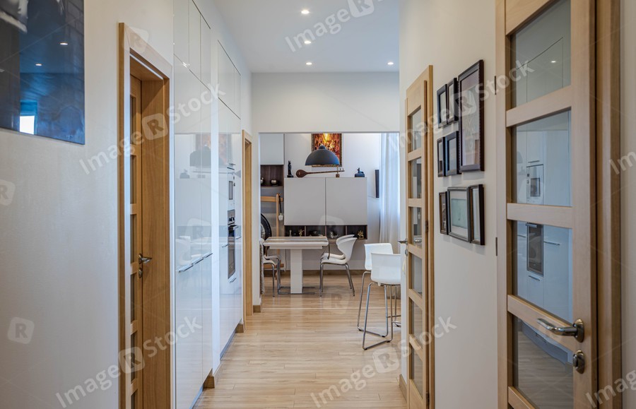 Contemporary interior of luxury apartment. Living room with table and chairs. White walls. Wooden doors.