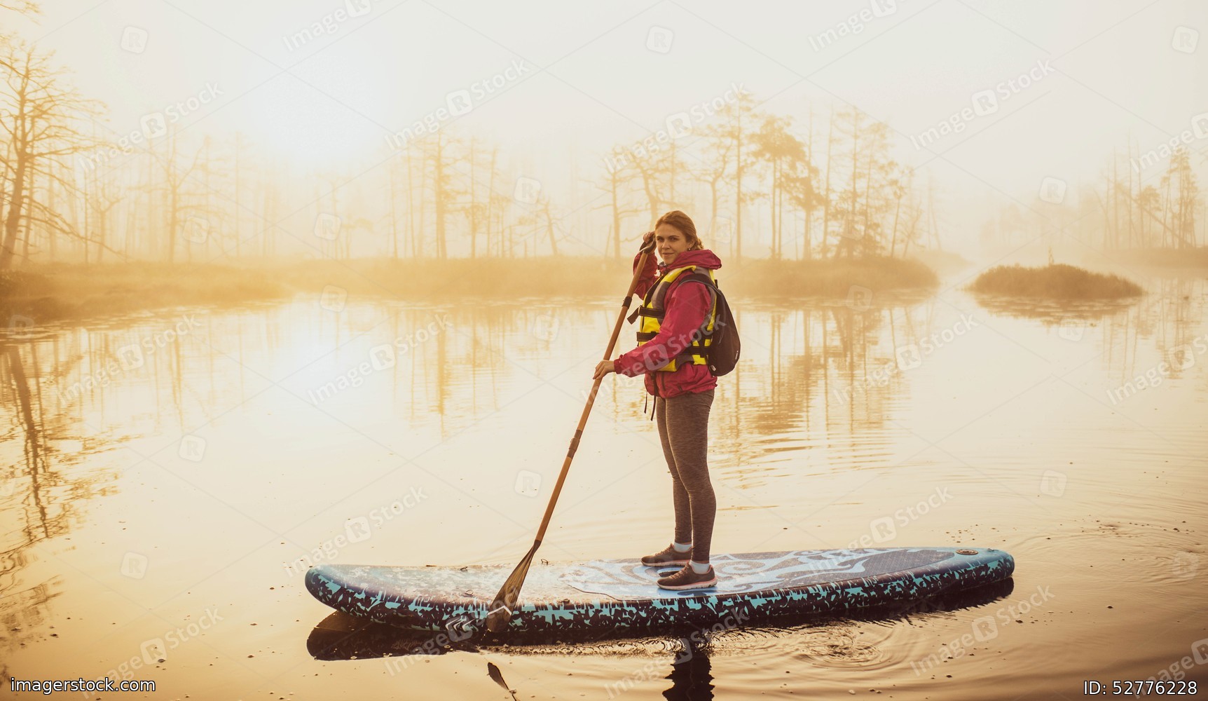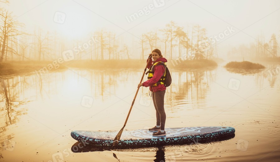 Woman slowly floating on the water on the sup-board. Fog and swamp.