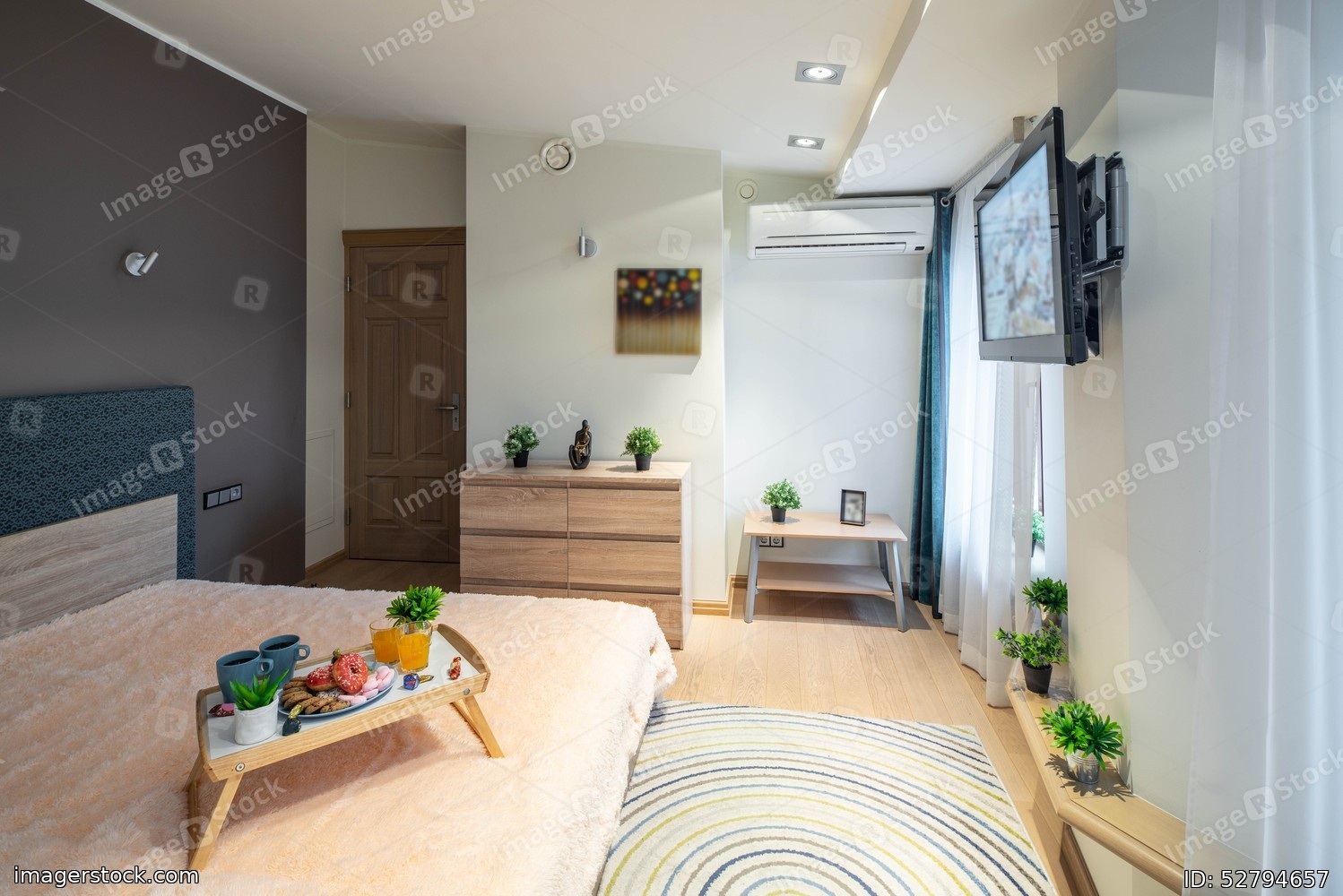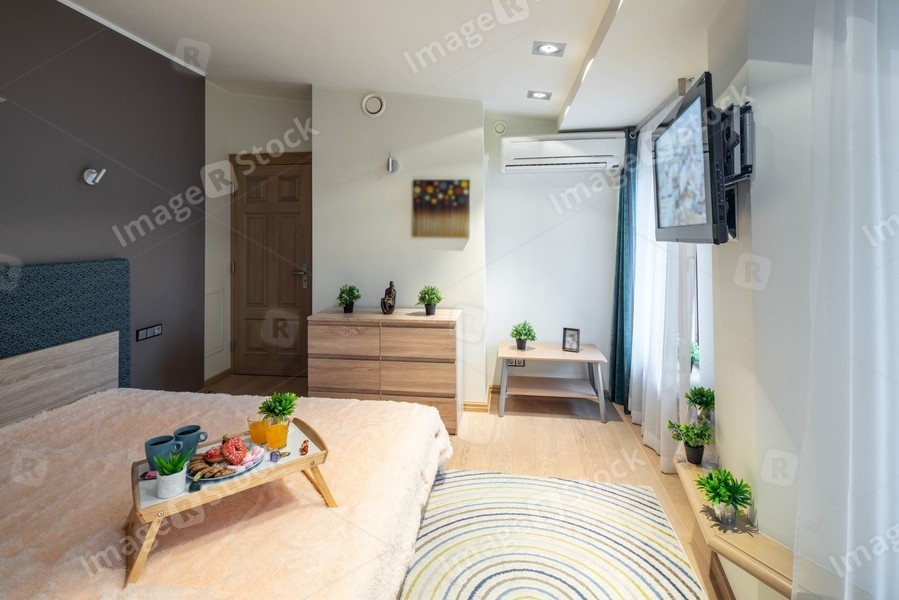 Bedroom in modern apartment. Interior. Light spacious room. King-size bed.