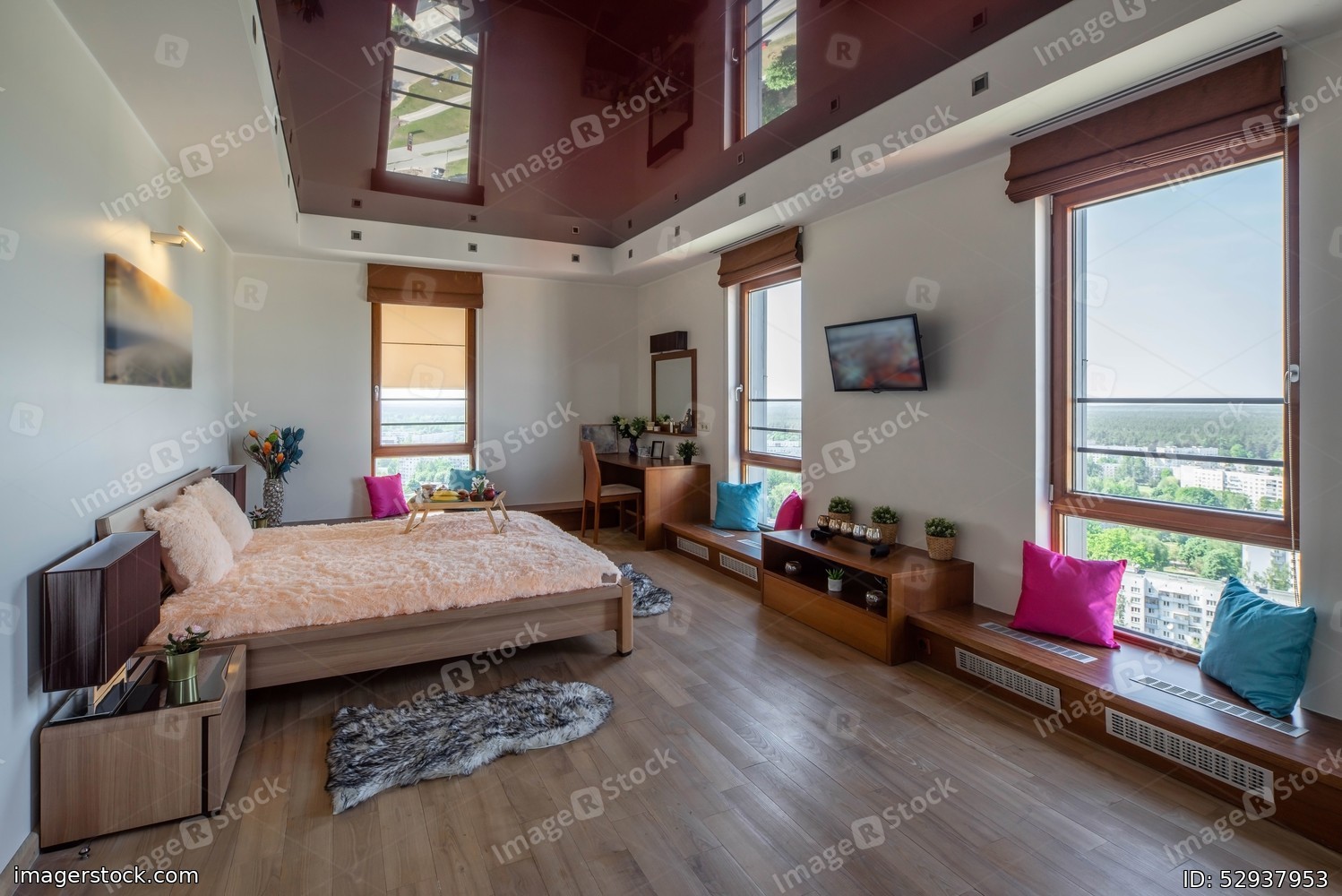 Bedroom in modern apartment. White walls. King-size bed. Light interior.