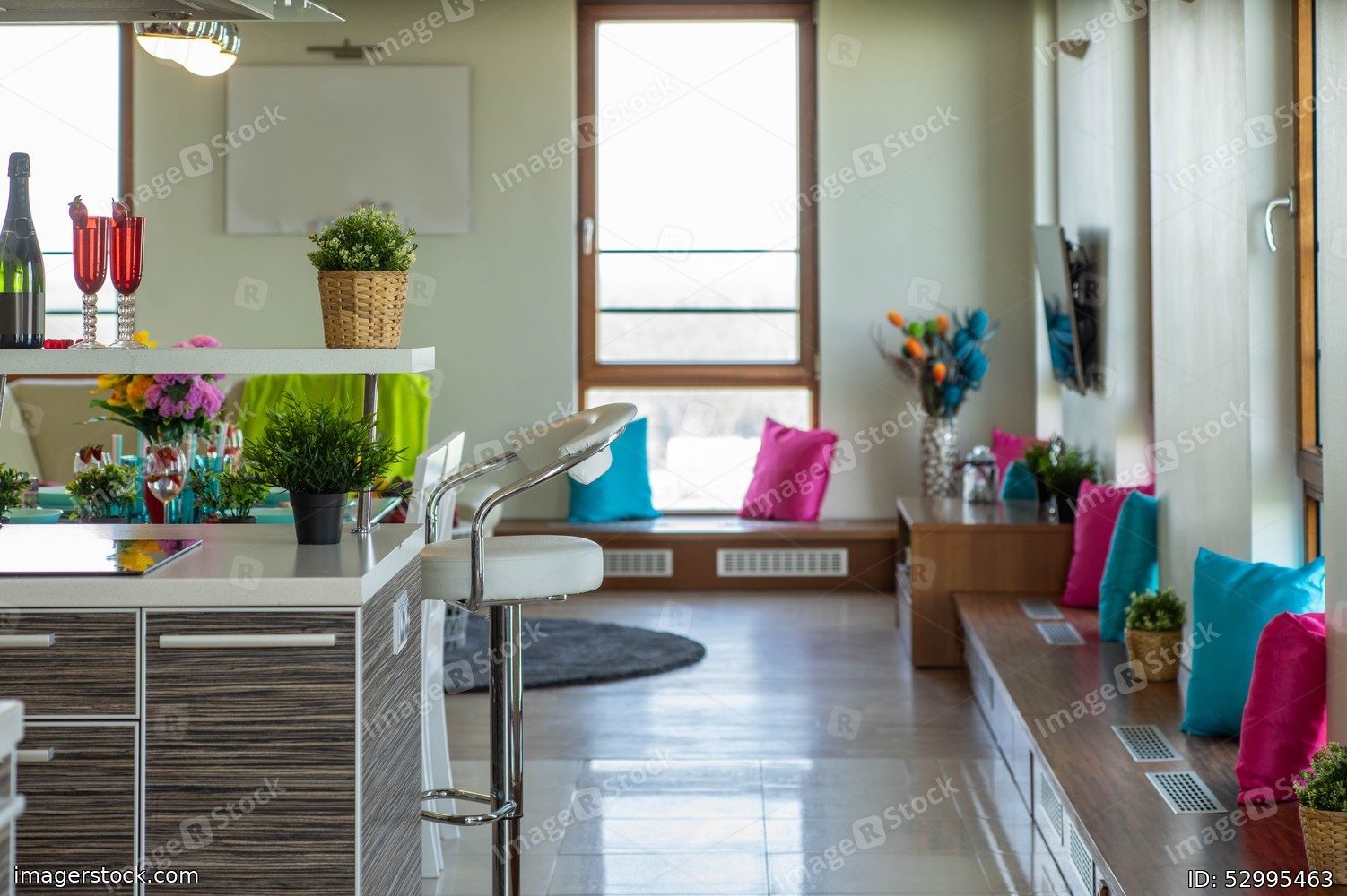 Modern interior of studio apartment in light tones. Living room. Kitchen surface.