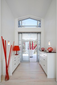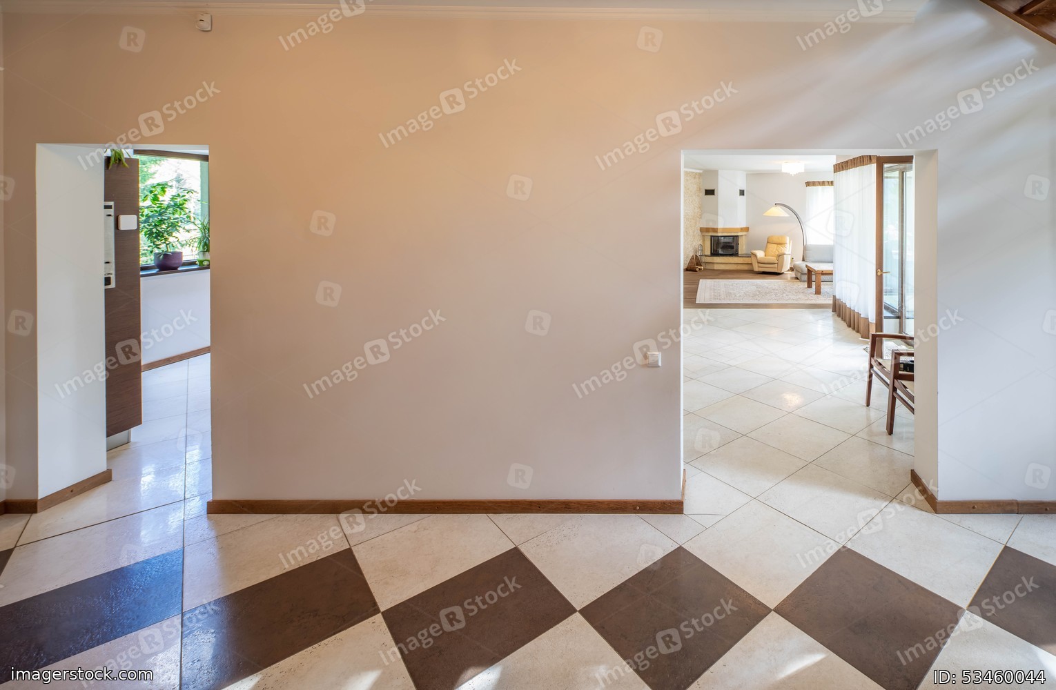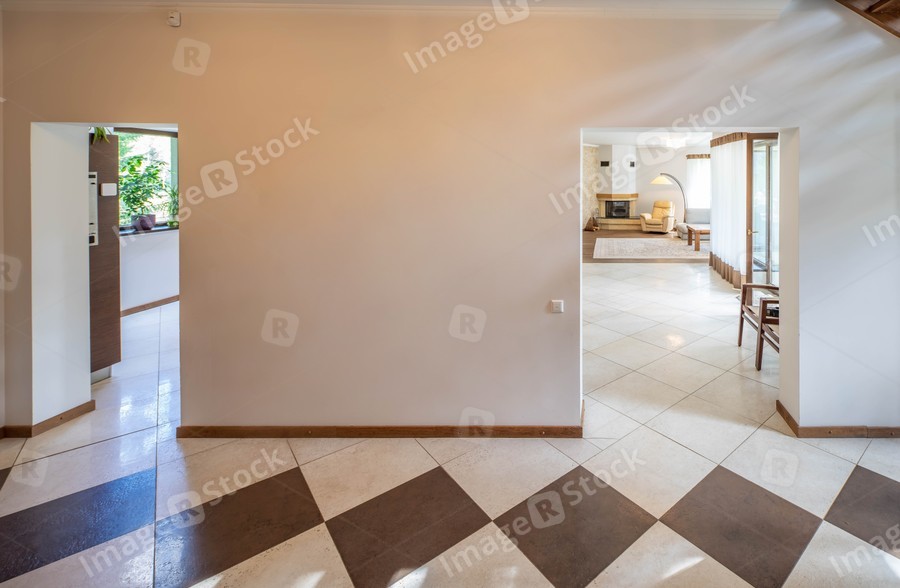 Interior of modern apartment. White wall. Way to living room. Fireplace, chair and lamp.