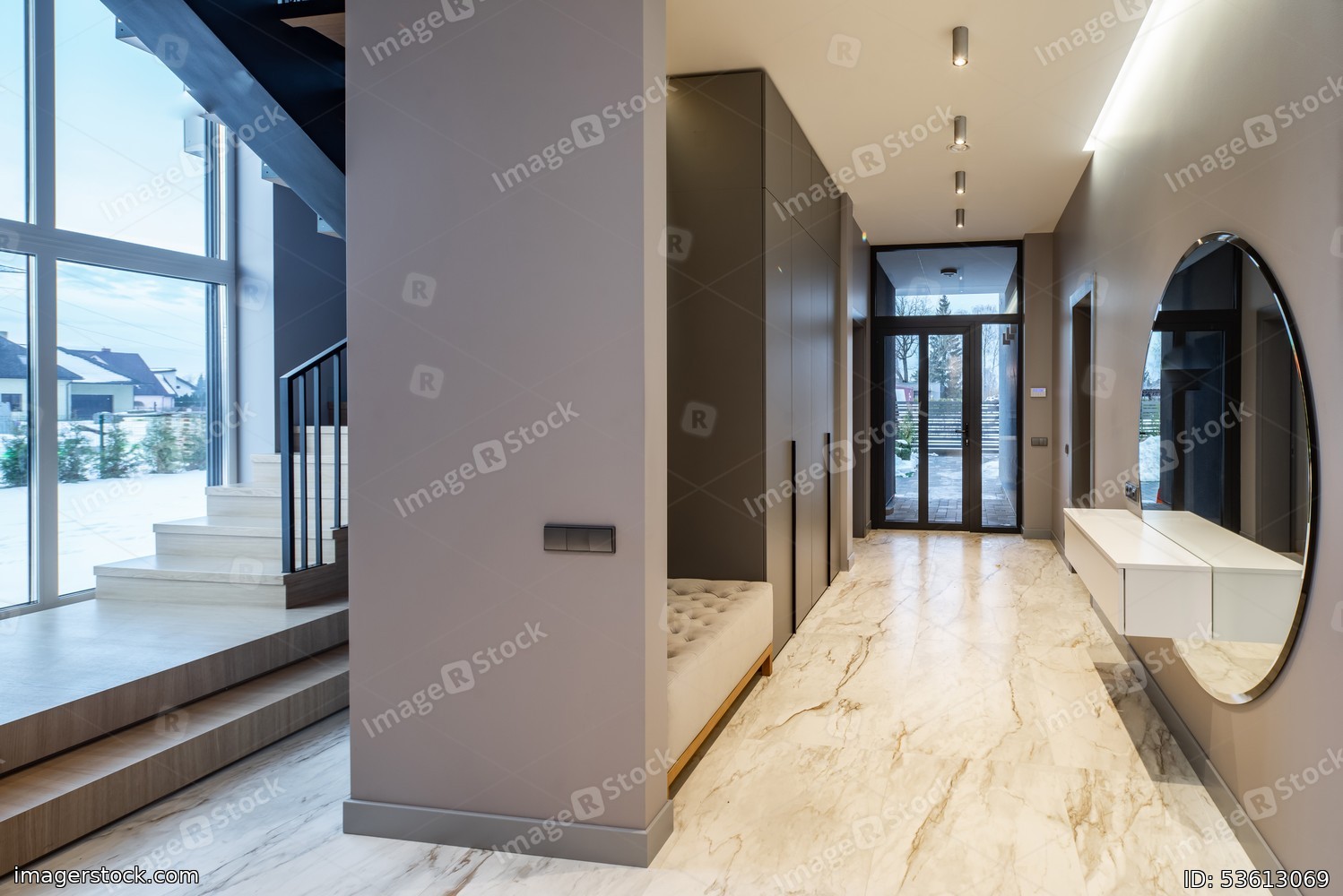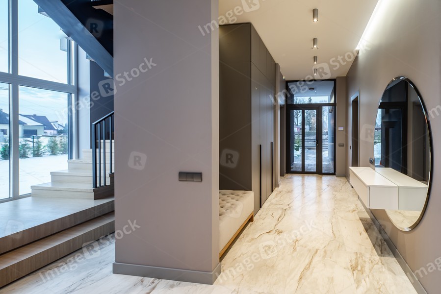 Interior of entrance hall with staircase in luxury house. Grey tones.