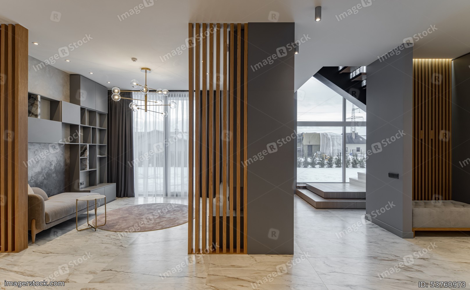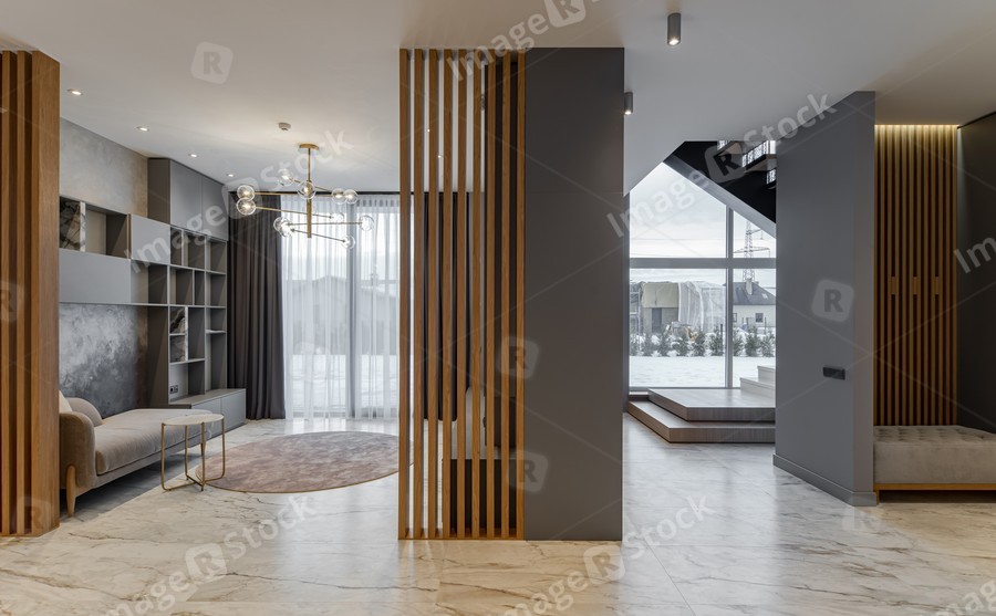 Modern interior of luxury private house. Grey tones. Wooden design.