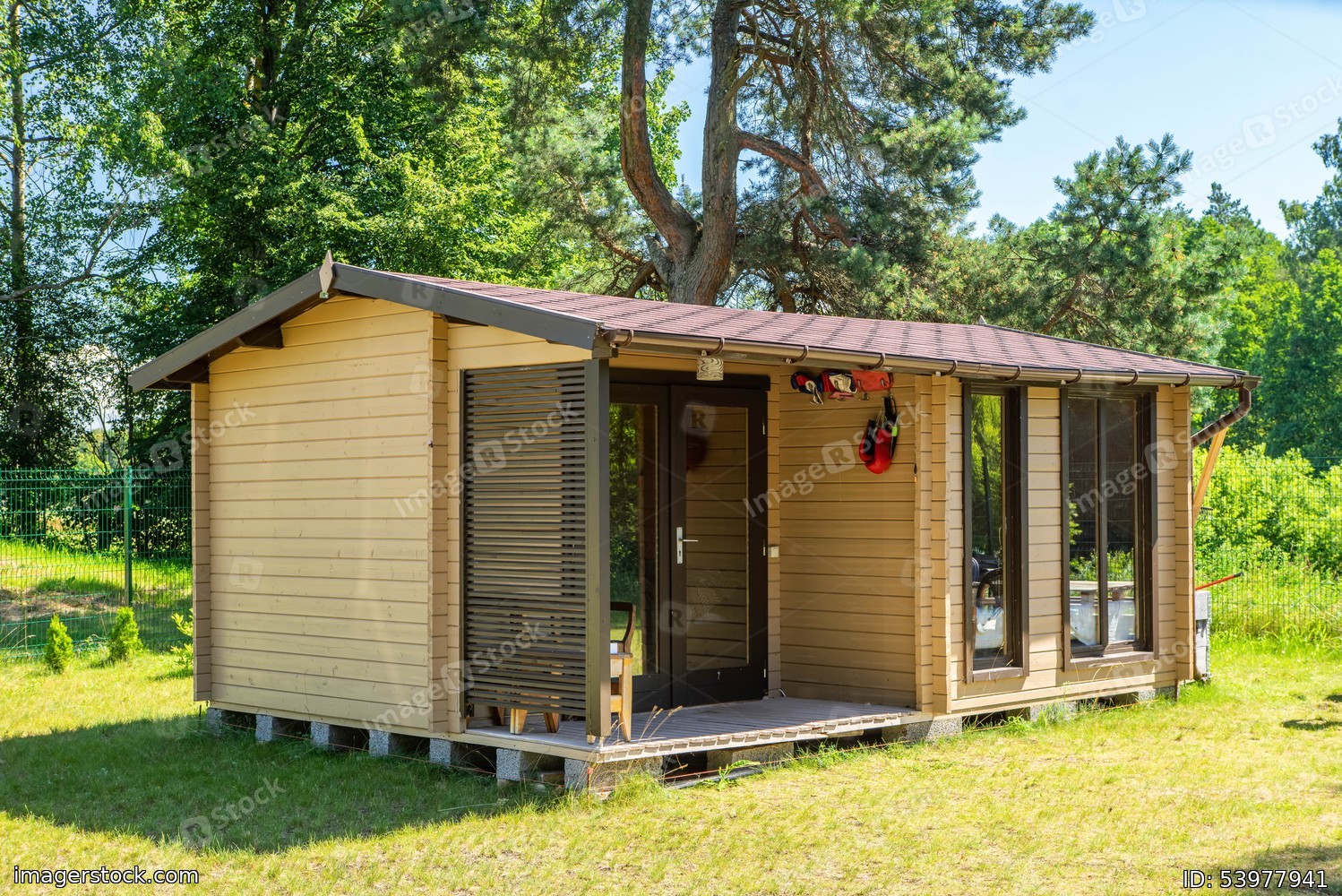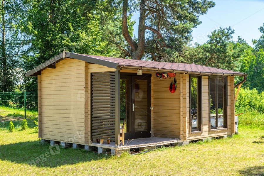 Private enclosed territory near the forest. Modern exterior of new small summer house. Sunny summer day.