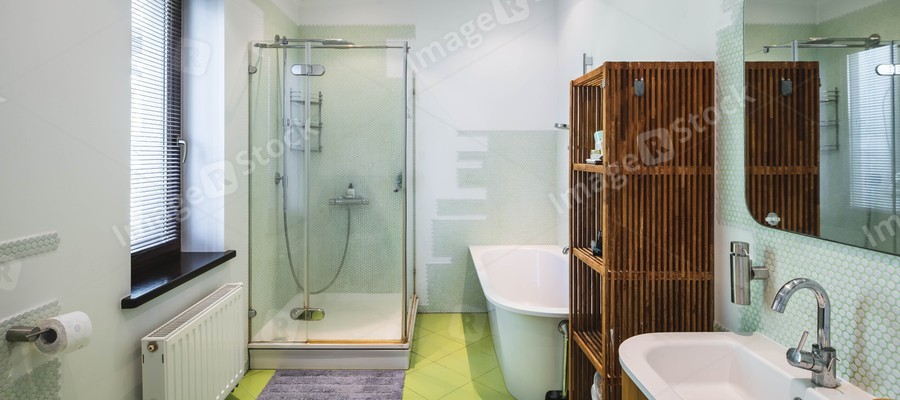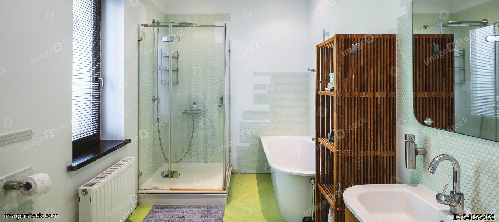 Modern interior of spacious bathroom. Shower cabin. White bath. Wooden shelf. Sink and mirror.