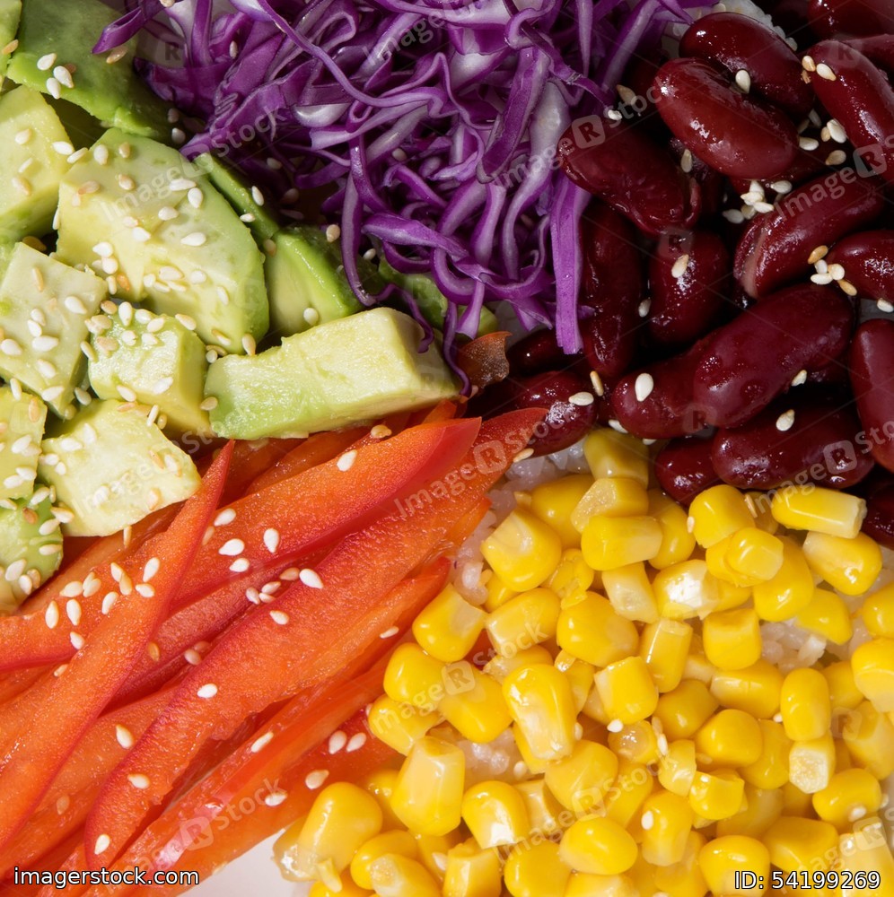Close-up of vegetarian food mix. Beans, paprika, purple cabbage, avocado and corn on the rice.